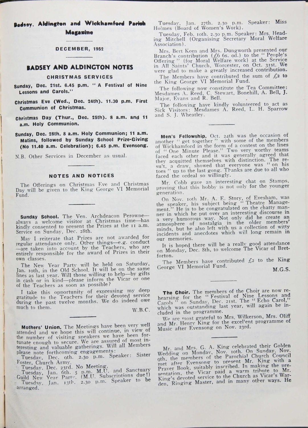 Monthly parish magazine, price 3s 6d per annum. Mr & Mrs G A King celebrated their Golden Wedding Anniversary. Baptisms - Rosemary Hay, Basil Melvin Hall, Terence William Chasty, Jonathan Peter Hardiman, Ronald Albert Stuart Anderson, Diane Clair Norledge (Badsey). Marriages - Francis Trevor Davis and Jean Stewart (Badsey).