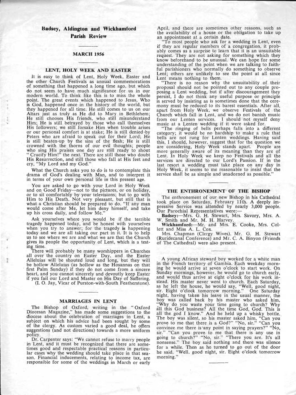 .Monthly parish magazine, no price given. Gives brief details of the enthronement of the new Bishop; mentions Mr & Mrs G H Stewart, Mrs Savory, Mrs A W Smith, Mr M H Harvey, Mr & Mrs E Cooke, Mrs Collett, Miss A L Cox, Mrs Chapman & Mr C A Binyon.