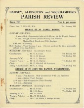 Copy of monthly parish magazine (original, size 18.5 cm x 23.5 cm, 2 glossy sheets folded as a wrapper for a national church magazine called The Sign, in Vicarage loft), price 4/- per annum, printed by John Knight & Sons, Evesham. Named personnel on front (Vicar - Rev P Braby); Badsey (Churchwardens - Mr G A Jones, Mr G H Stewart; PCC Secretary – Mr H L Hatcher; PCC Treasurer - Mr M H Harvey; Clerk – Mr E Mitchell, 68 Synehurst; Deputy Churchwarden – Mr G A King; Wickhamford (Churchwardens – Mr E Cooke, Mr J E Parry; PCC Secretary - Mrs E Cooke; PCC Treasurer – Mrs T H Collett; Clerk – Mr C H Willis, 3 Sandys Avenue). Includes separate letters from the vicar Peter Braby to Badsey & Aldington and Wickhamford. Bell Ringers: Mr Tony Brazier announced his resignation as Ringing Master for Badsey, Mr Colin Longmore was elected in his place, also mentions Mr Douglas Bott and Mr E Mitchell. Baptisms - Sally Anne Hardiman, Martin James Dore (Badsey). Marriages - Desmond Charles Gisbourne and Daphne Ann Salter (Badsey). Burials - Alice Louisa Keen (Badsey). Adverts placed by: C Savage & Son, Builders, Badsey; Marshall's, The Post Office, Badsey, Hodgetts, Cycles, Prams & Toys, Bridge Street, Evesham; C J Bird, The Stores, Bretforton Road, Badsey.