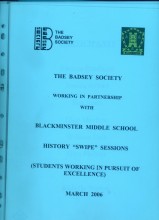 Ring-bound booklet containing worksheets used by The Badsey Society in a workshop with a small number of pupils from Blackminster Middle School, in History "Swipe" (Students Working in Pursuit of Excellence) Lessons, 2006.