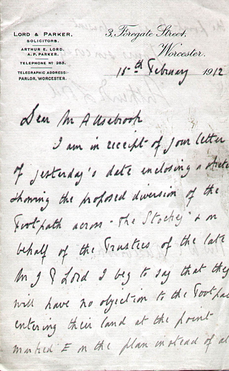 Letter from Lord & Parker, Solicitors, to W C Allsebrook, concerning diversion of The Stockey footpath.