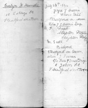 The inside front of the book contains the name Evelyn K Hands and address of 18 College Street, Stratford on Avon. The first page has the date 26th July 1894 and lists the following people: Joyce J Davis, Cross Hill, Stratford on Avon, c/o J J Davis, Esq; M F Neale, Slapton Rectory, Leighton Buzzard; M Scott, Bidford, Stratford on Avon; Miss J Ferrar, c/o Reverend F Hastings, 8 John Street, Stratford on Avon. At the other end of the book it says "E Hands, Music, October 13th 1894" and then has 15 pages of Scales' practice.