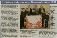Newspaper article about Badsey First School children helping to revamp Badsey Remembrance Hall. Includes photograph of Rob Kettley, Julie Jones (Headteacher), Marcelle Wilkes (Committee member), with five pupils.