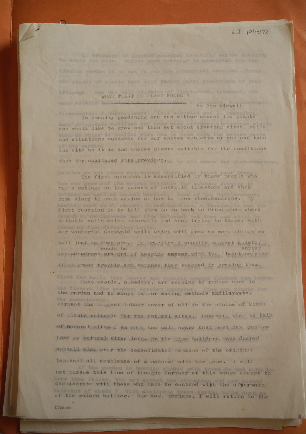 Folder containing manuscripts for the Answers to Gardening Questions series (1978-1979): (i) What to Plant Where? (ii) Beds, Borders and Gardens; (iii) Ground Cover; (iv) Can they be moved? (v) Perfume; (vi) The place for climbers; (vii) Lacecaps; (viii) Water Gardens; (ix) Bindweeds; (x) Wind and Wind Breaks; (xi) In Praise of Box; (xii) The Autumn Garden; (xiii) Conifers; (xiv) The not so hardy climbers; (xv) Some big plants for big places; (xvi) The flowers of Shakespeare.