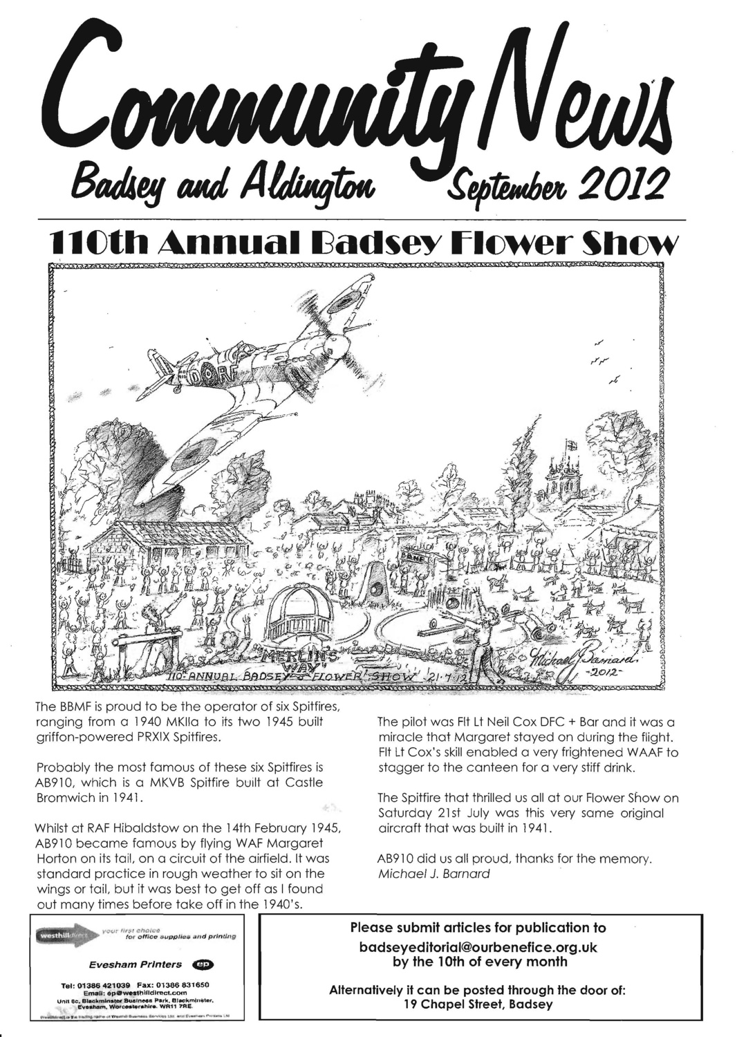 Free copy of the Badsey & Aldington monthly parish newsletter, 29.7cm x 21cm, 2 sheets of A3 folded to make A4 pages. Includes letter from the Vicar Richard Court. Badsey register: baptisms of Jennifer C McGuire, Matilda E Atkins, Quinton R A Legge-Geuter & James P England; funerals of Denis R Grinnell & Joyce Haynes; marriages of Ashley R Wall & kathryn Brooks & Matthew P Babbage & Suzanne J Aldren. badsey events: Tower News, Jigsaw, Flower Guild, Round Robin, Mother's Union, PC News, W. Gardening Club, film Club, St. Richard's Hospice, WI & RBLWS. Articles: Guide Leader Elizabeth Bolland MBE, 110th Flower Show with illustration by Michael J Barnard, Junior Choir by Sally Mitchell, Caring People by Y HaynesVoix d'ete by Sue Cole, Game Makers - Maureen Spinks.