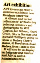 News article from Evesham Journal of Thursday, July 3rd, 2014 on Art exhibition being held at Cherry House, Badsey for Ian Gibson, Richard Phillips, Will Clapton, Hazel Green & Gloria Norman