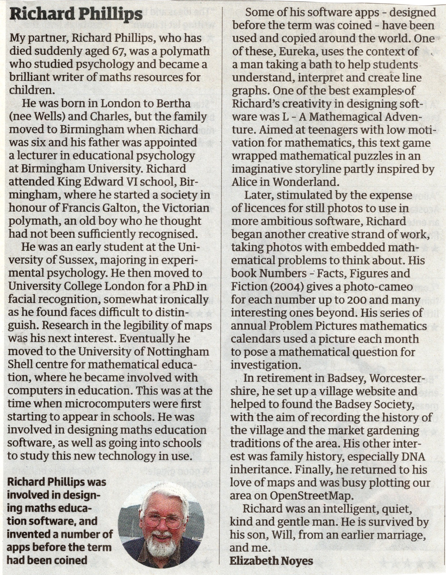 Obituary written by Lizzie Noyes for publication in the "Other Lives" section of The Guardian newspaper about the life of her partner, Richard Phillips (1947-2015).  Plus the actual article which was published in the newspaper.