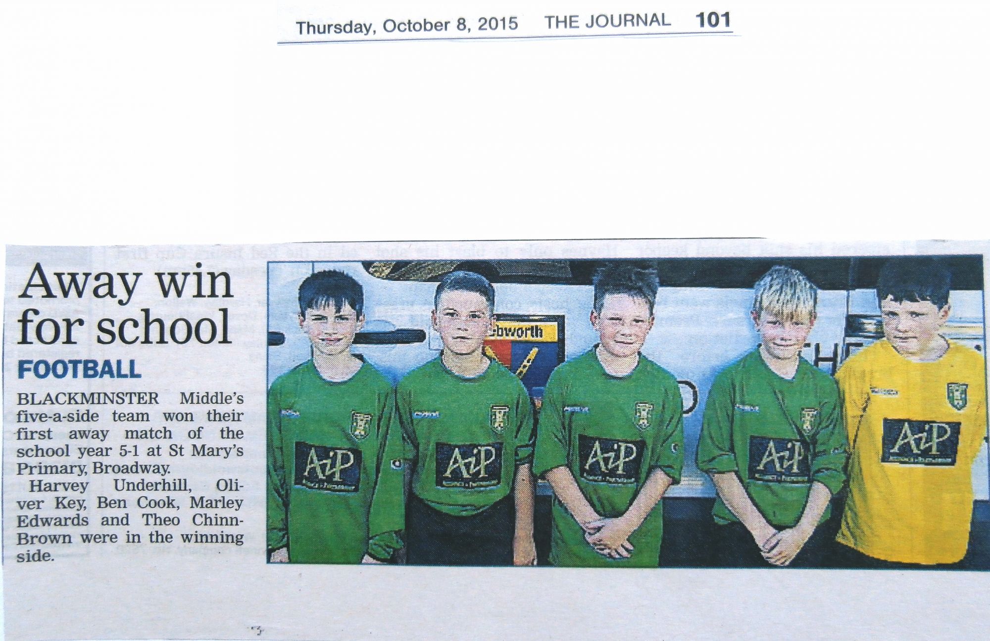 Article stuck onto A4 sheet of paper from The Journal dated Thursday, October 8th, 2015 about Blackminster Middle School five-a-side football win in Broadway with a picture of the team, Harvey Underhill, Oliver Key, Ben Cook, Marley Edwards & Theo Chinn-Brown.