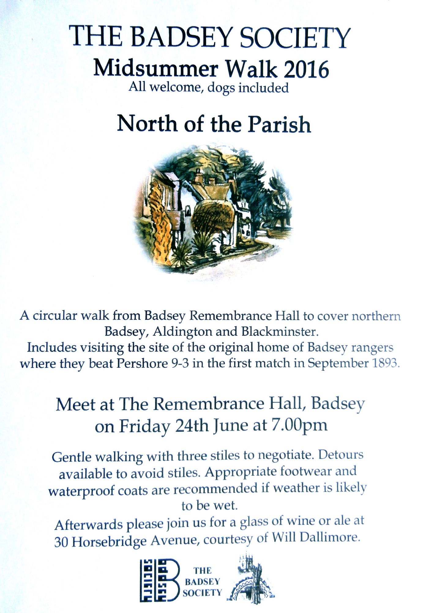 1 sheet of A4 paper with details of The Badsey Society's "Midsummer Walk 2016" covering North Badsey, Aldington and Blackminster meeting at the Badsey Village Hall on June 24th 2016 at 7p.m. with refreshments afterwards