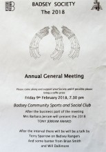 1 x A4 sized poster for the Badsey Society AGM on Friday 9th February 2018 at 7.30p.m. at the Badsey Community Sports & Social Club with the presentation of the Tony Jerram Award & talks by Terry Sparrow, Brian Smith & Will Dallimore.