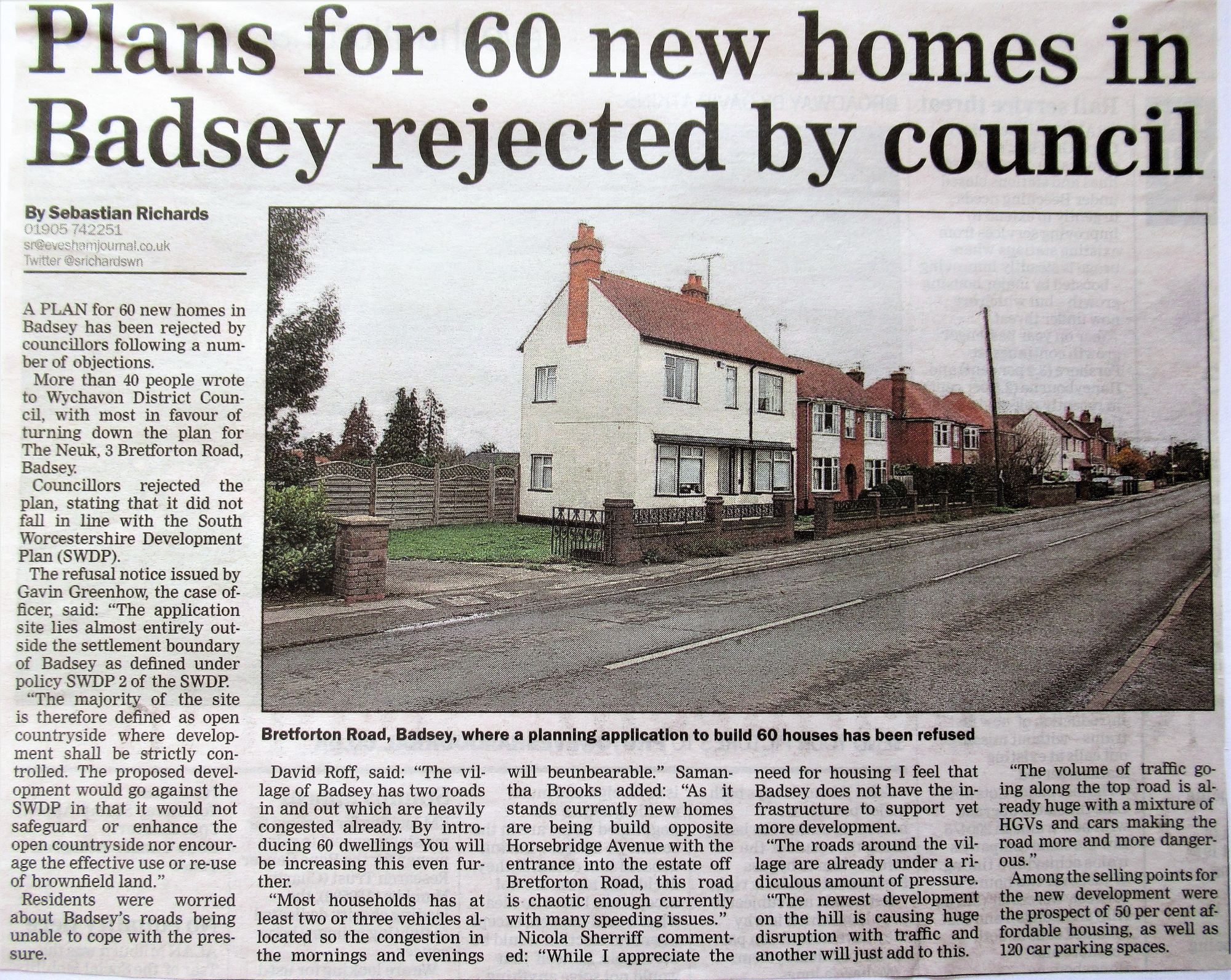 Newspaper article from the Evesham Journal written by Sebastian Richards about rejection of plans to build 60 new homes off the Bretforton Road, Badsey with comments from Gavin Greenhow, David Roff, & Nichola Sherriff with 1 photograph