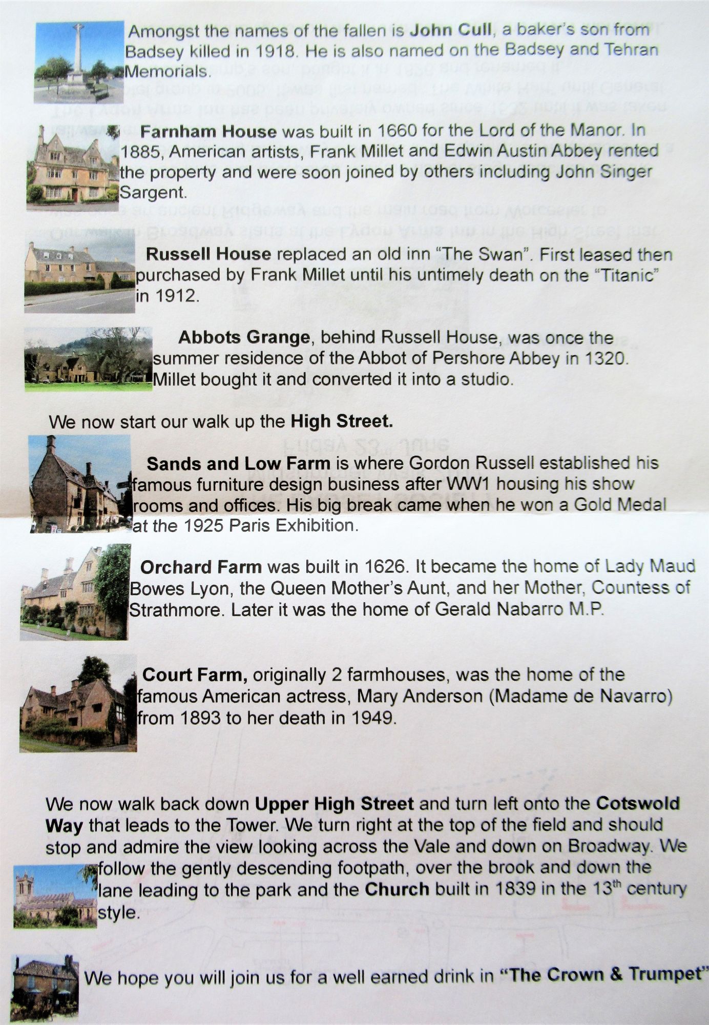 1 x A4 paper folded to make a leaflet for the Badsey Society Midsummer Walk in Broadway on Friday 23rd June 2017 with a map, information on places of interest & photographs compiled & led by Jane Neill