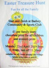 1 x poster advertising an Easter Treasure Hunt starting and finishing at Badsey Community & Sports Club on Mon. 22nd April 2019 from 11am sponsored by the Badsey and Aldington Parish Council