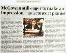 1 x newspaper article from the "Daily Telegraph" written by Callam Adams dated Mon. 18th March 2019 about Alistair McGowan taking up his new profession as a concert pianist
