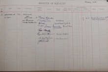 Leather-bound register with the following columns for completion: date, day hour, service, celebrant or officiant, preacher, text or subject, number of communicants, attendances, collections, object, remarks. The first entry was for 25th January 1958, the institution and induction of the Reverend Peter Braby by the Bishop of Worcester. Printed for the Society for Promoting Christian Knowledge.