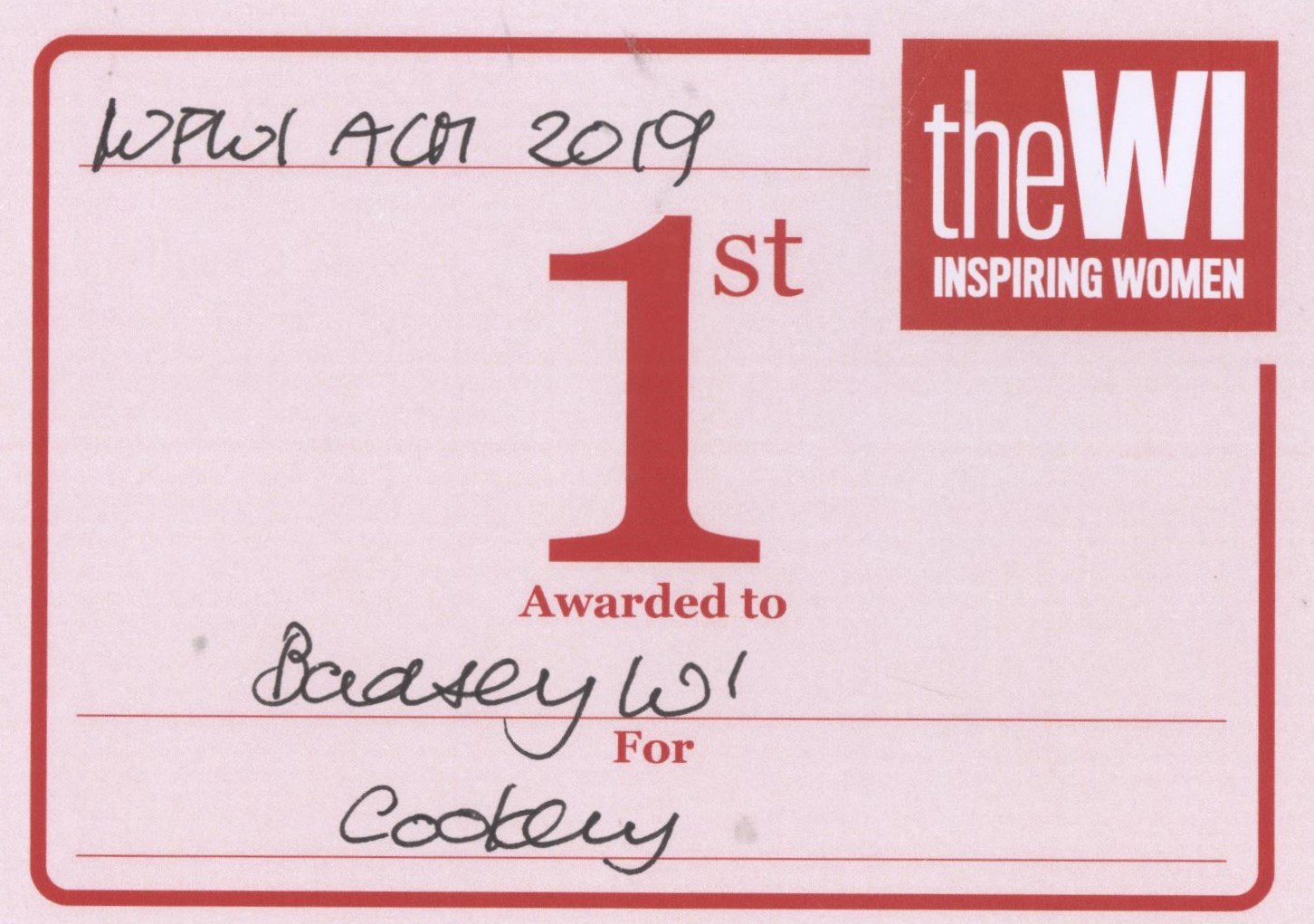 1 x mauve card awarding first prize to the Badsey WI for Cookery by the WFWI at the Annual Council Meeting in 2019