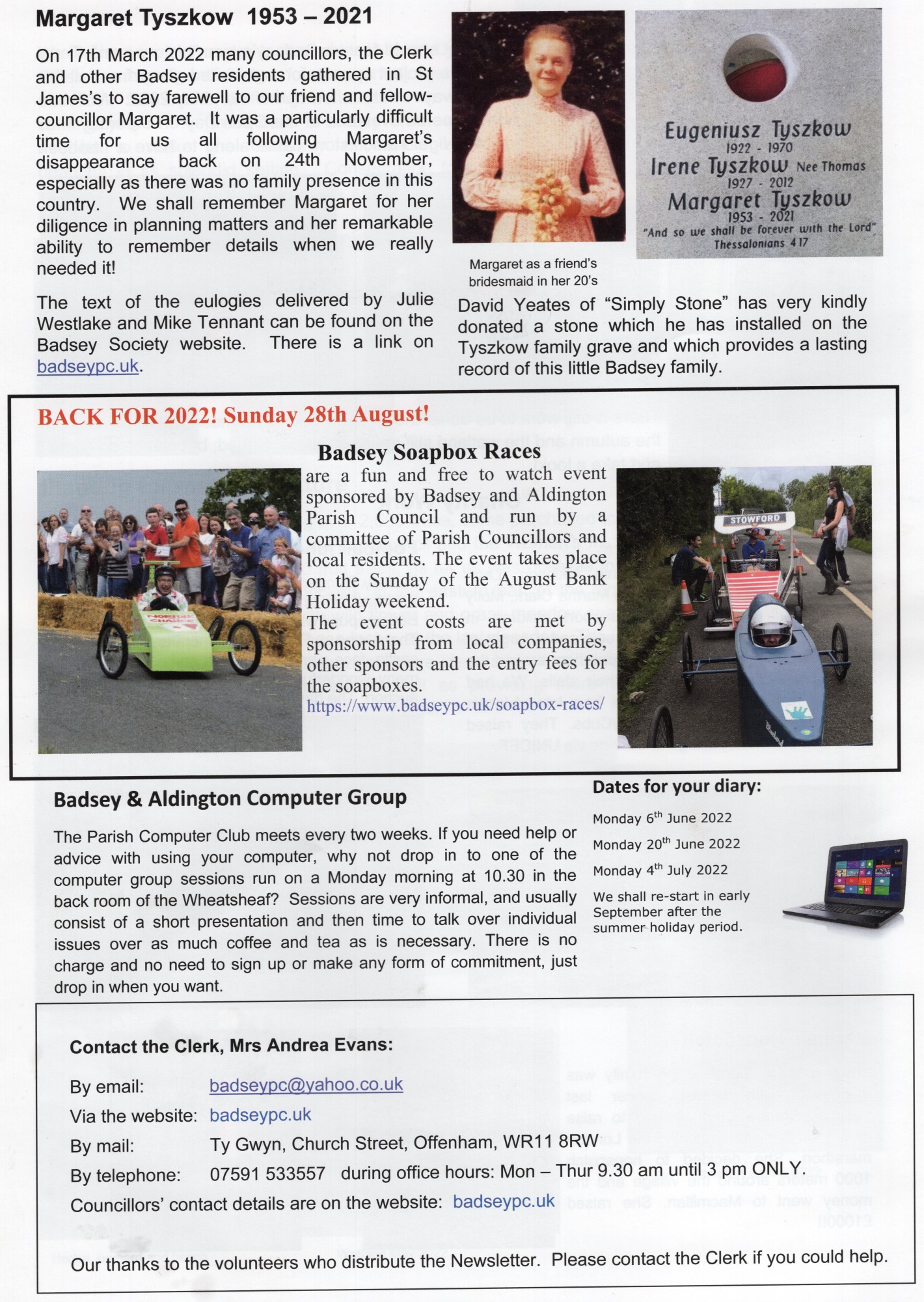 Parish Council Newsletter distributed free to all households in the village. Includes items on Parish Precept the opening of Pear Tree Fields, the cemetery, charity work, Margaret Tyszkow (1953-2021), Badsey Soapbox races 2022, Computer Club.