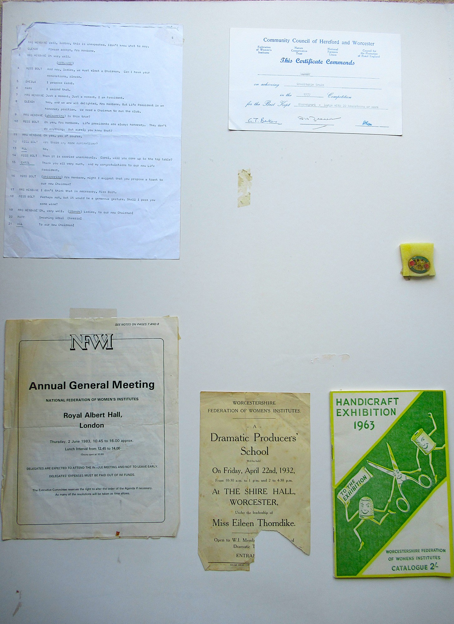 2 x card folded to make a Badsey WI display board. Board 1 has a part script, certificate for upkeep of graveyard, AGM meeting programme of 1983 held at the Royal Albert Hall, Play bill for WFWI production by Miss Eileen Thorndike dated 1932, an original WI badge & Handicraft exhibition booklet of 1963 featuring Badsey WI entries from Mrs. Cole Class 13 embroidery, Mrs. Sparrow & Mrs. Major Class 30 for cardigan & Mrs. Hughes Class 39 metalwork who had maximum points awarded for her entry. Board 2 has "Home & Country" journal dated August 1st 1931, a letter from Michael Spicer M.P., letter from BBC for recording in Badsey of "Modlyn off the Motorway", Mrs. Hughes metalwork card from competition & AGM position of seat holders.