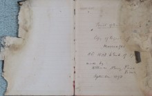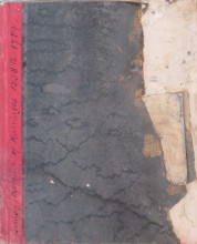 Hard-back book with lined pages badly damaged by water caused by a flood when kept in the church
