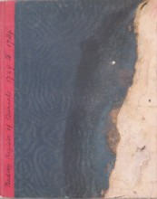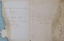 Hard-back book with lined pages badly damaged by water caused by a flood when kept in the church