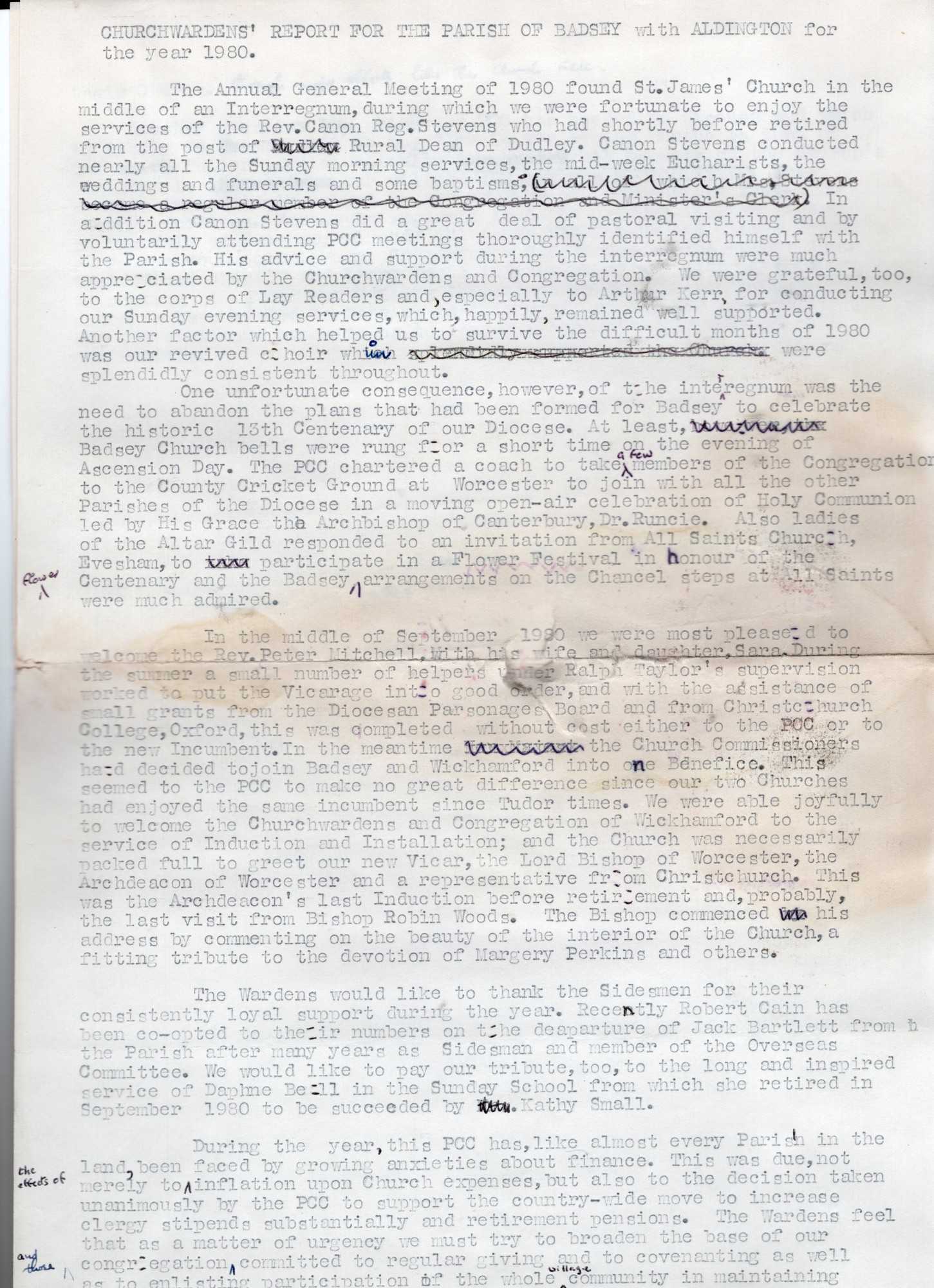 Report of the proceedings of Badsey Parochial Church Council for the year 1980, delivered at the Annual Parish Meeting on 26th April 1981, with accompanying reports: Badsey Church Insurance, Recipts and Payments Account, Churchwarden's report, Report on church fabric, Stewardship Scheme, Electoral Roll, Social Committee Report, Overseas Committee, Sunday School Report, Mothers' Union Report, Sidesmen (see PDF below for full transcription).