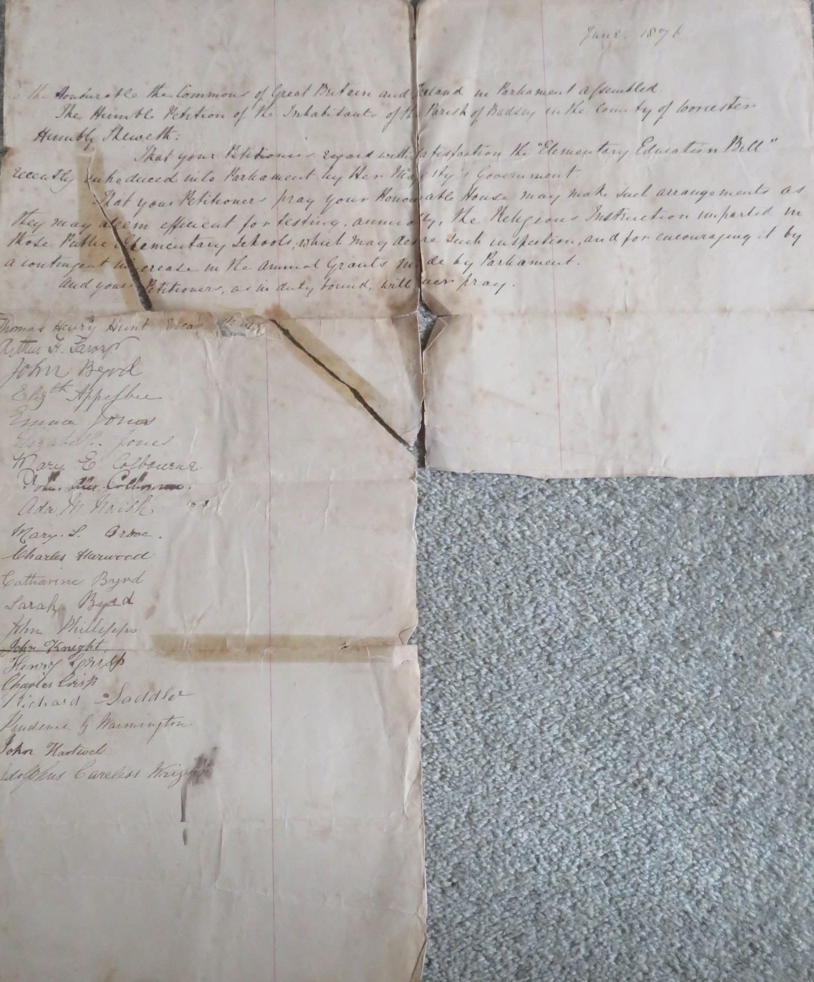 That your petitioners regard with satisfaction the “Elementary Education Bill” recently introduced into Parliament by Her Majesty’s Government.That your petitioners pray your Honourable House may make such arrangements as they may deem efficient for testing annually the Religious Instruction imparted in those Public Elementary Schools which may [?] such inspection, and for encouraging it by a contingent increase in the Annual Grants made by Parliament.