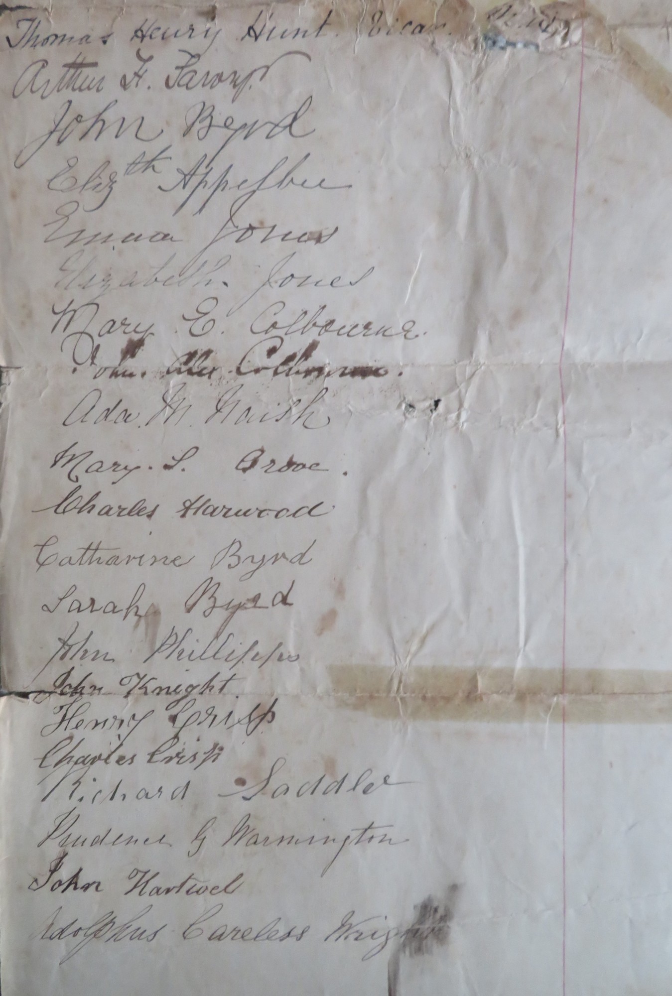The petition was signed by: Thomas Henry Hunt (Vicar), Arthur H Savory, John Byrd, Elizabeth Appelbee, Emma Jones, Elizabeth Jones, Mary E Colbourne, John Alex Colbourne, Ada M Naish, Mary S [?], Charles Harwood, Catharin Byrd, Sarah Byrd, John Phillipps, John Knight, Henry Crisp, Charles Crisp, Richard Saddler, Prudence G Warmington, John Hartwell, Adolphus Careless Wright.