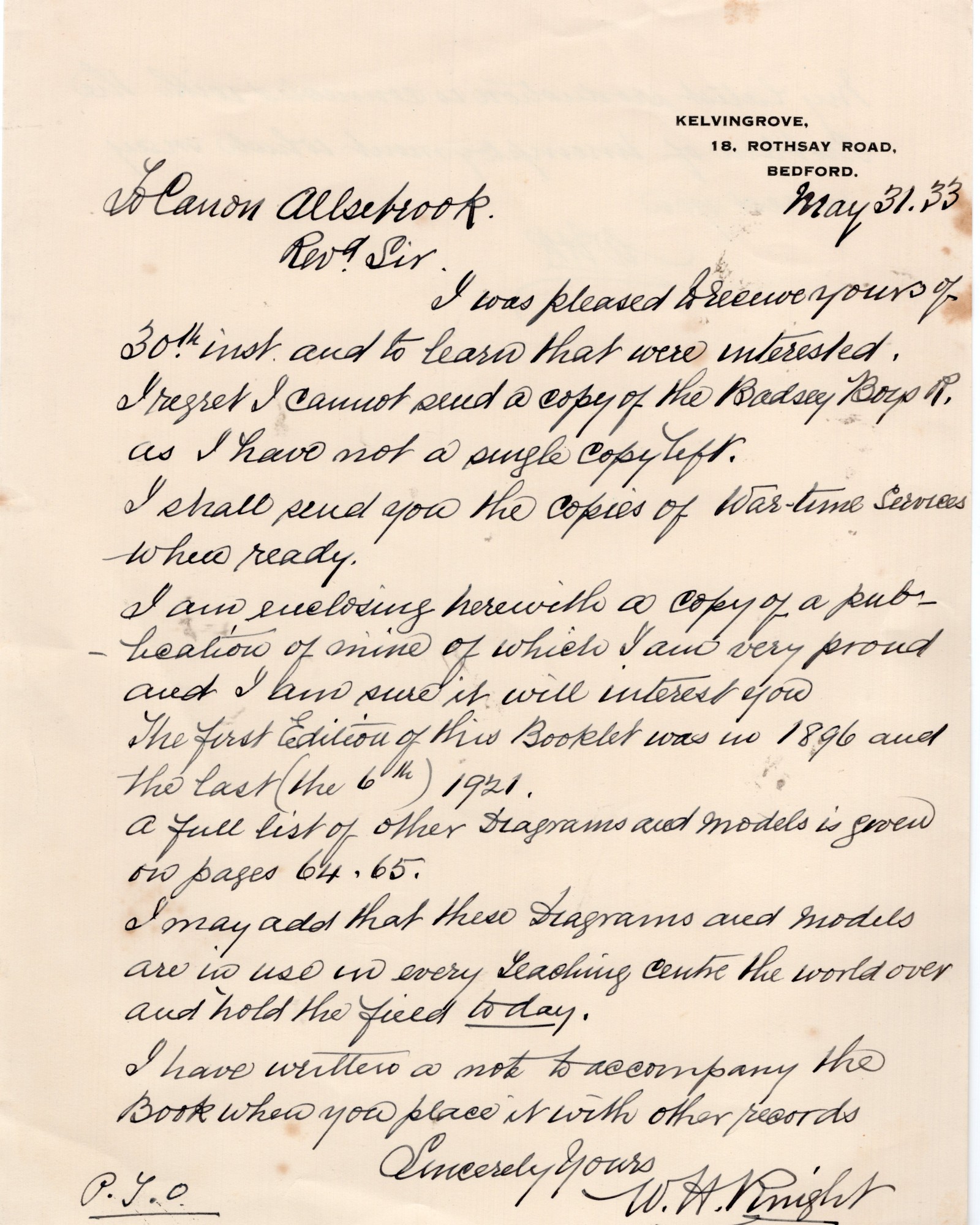 Letter written by W H Knight of Kelvingrove, 18 Rothsay Road, Bedford, to Canon Allsebrook, 31st May 1933, enclosing the booklet entitled Diagrammettes, of which he was very proud, and would be sending copies of War-time experiences when ready.