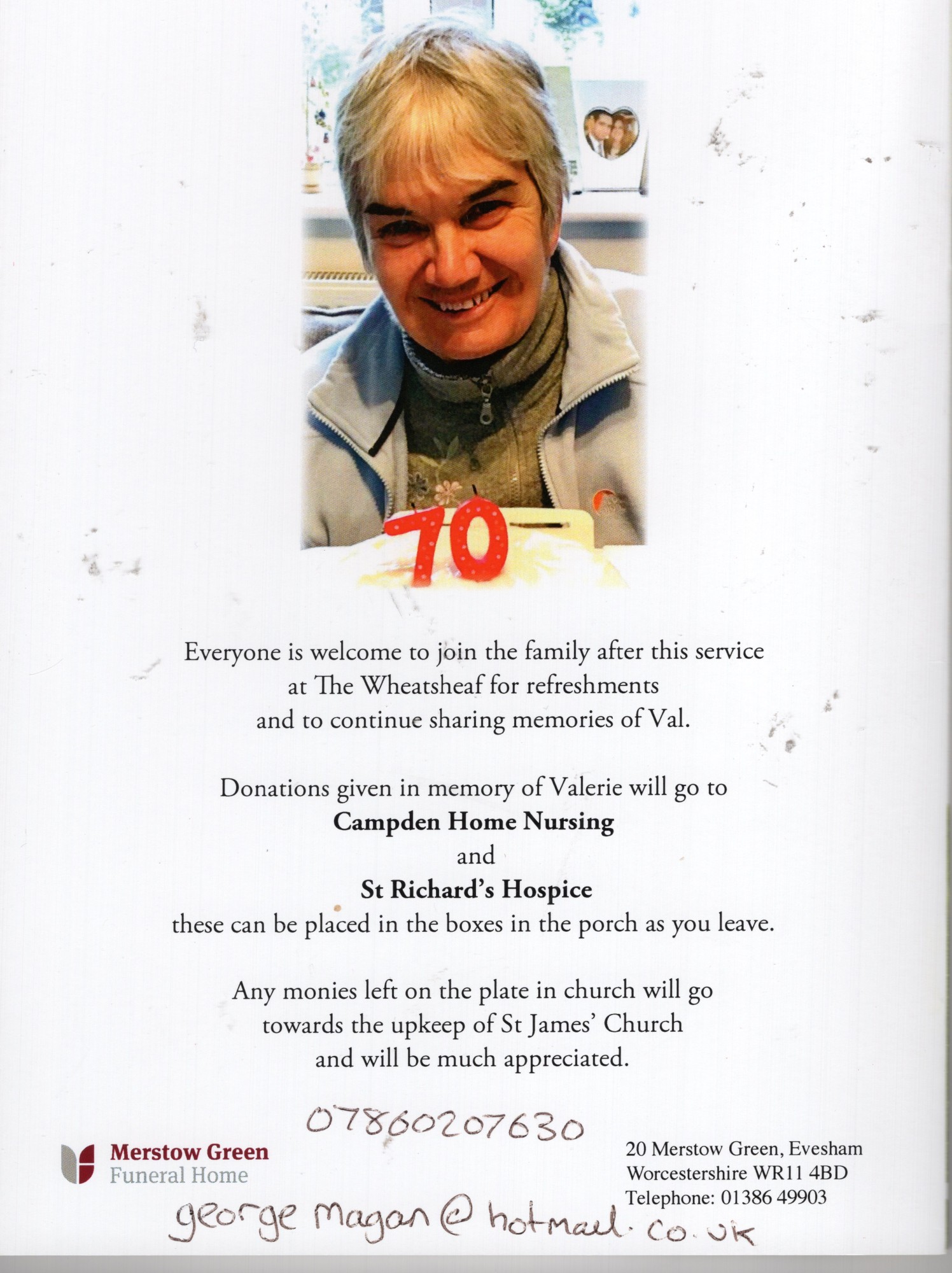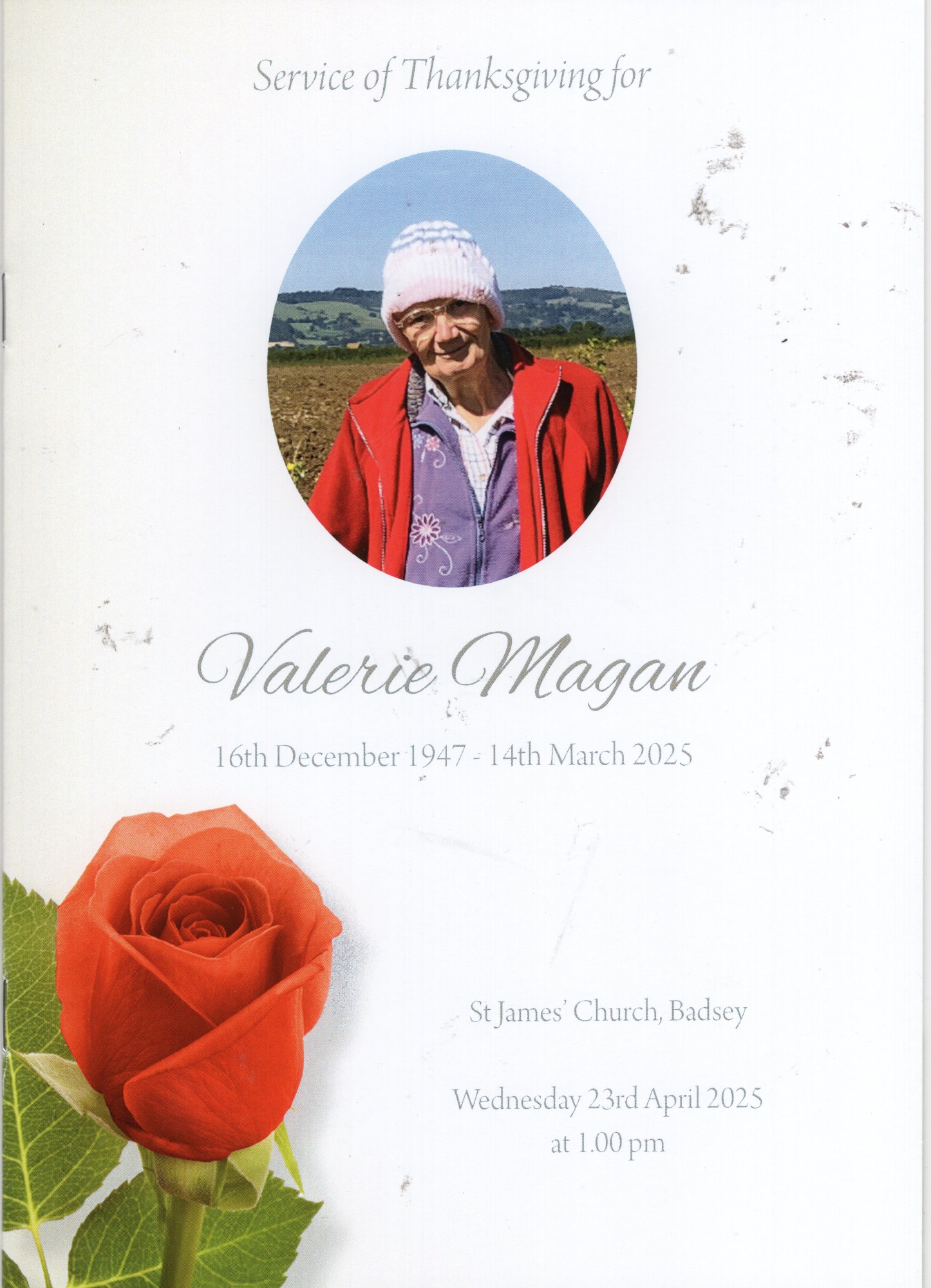 Order of Service for the funeral of Valerie Magan at St James' Church, Badsey, on Wednesday 23rd April 2025.
