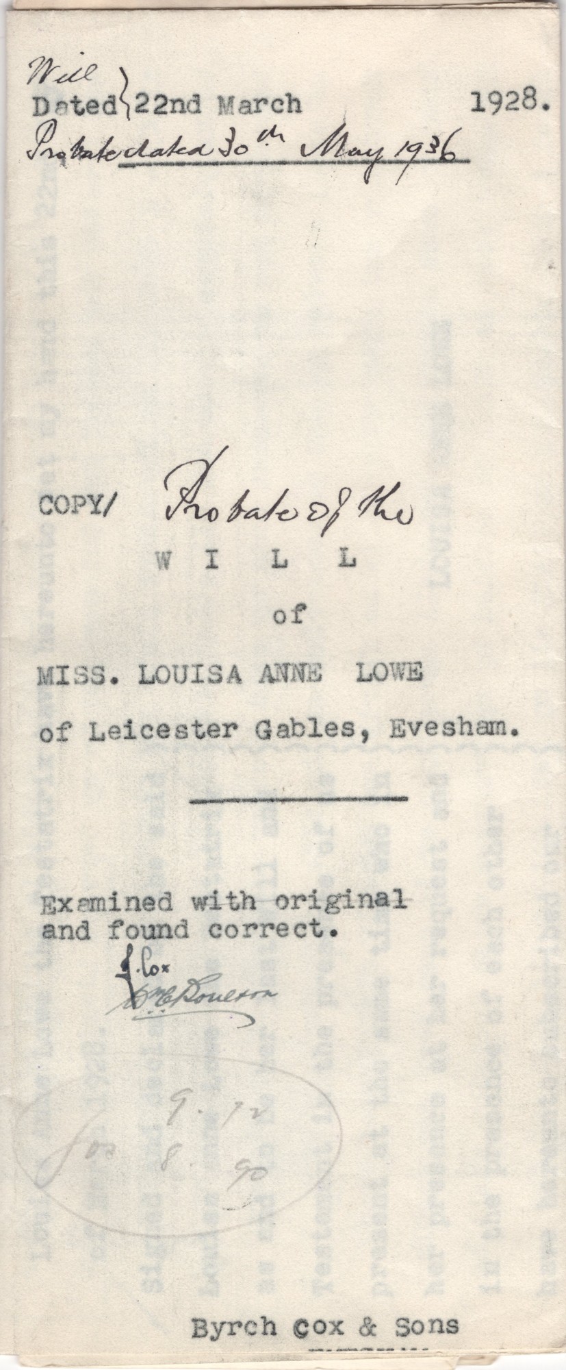 Copy probate of the will of Miss Louisa Anne Lowe of Leicester Gables, Evesham, will dated 22nd March 1928, probate dated 30th May 1936, Byrch Cox & Sons.