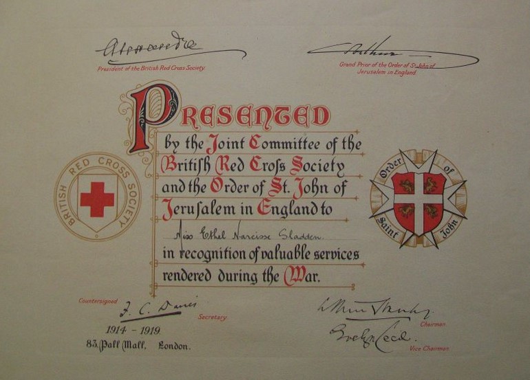 Certificate presented by the Joint Committee of the British Red Cross Society and the Order of St John of Jerusalem in England to Ethel Narcisse Sladden “in recognition of valuable services rendered during the War”.