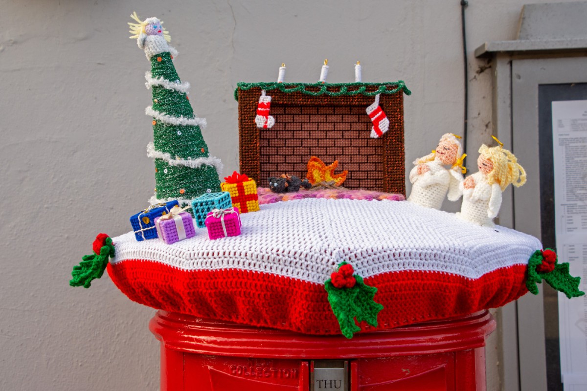 Knitted postbox toppers at Badsey Post Office