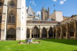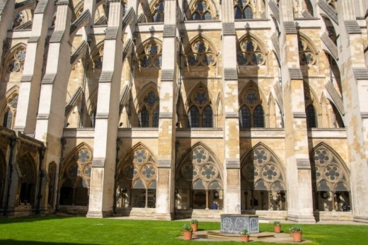 View across the Cloister Garth from the South Cloisters looking towards the North Cloisters. The fountain in the centre commemorates Lancelot Capability Brown.
