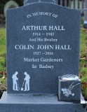 Memorial location St. James’ Church, Badsey » Section D Headstone IN MEMORY OF ARTHUR HALL 1914 - 1983 And His Brother COLIN JOHN HALL 1927 - 2016 Market Gardeners In Badsey [A.H./R5/P26/203/ B9.12.1983/ Aged 69 years/C.J.H./ Headstone