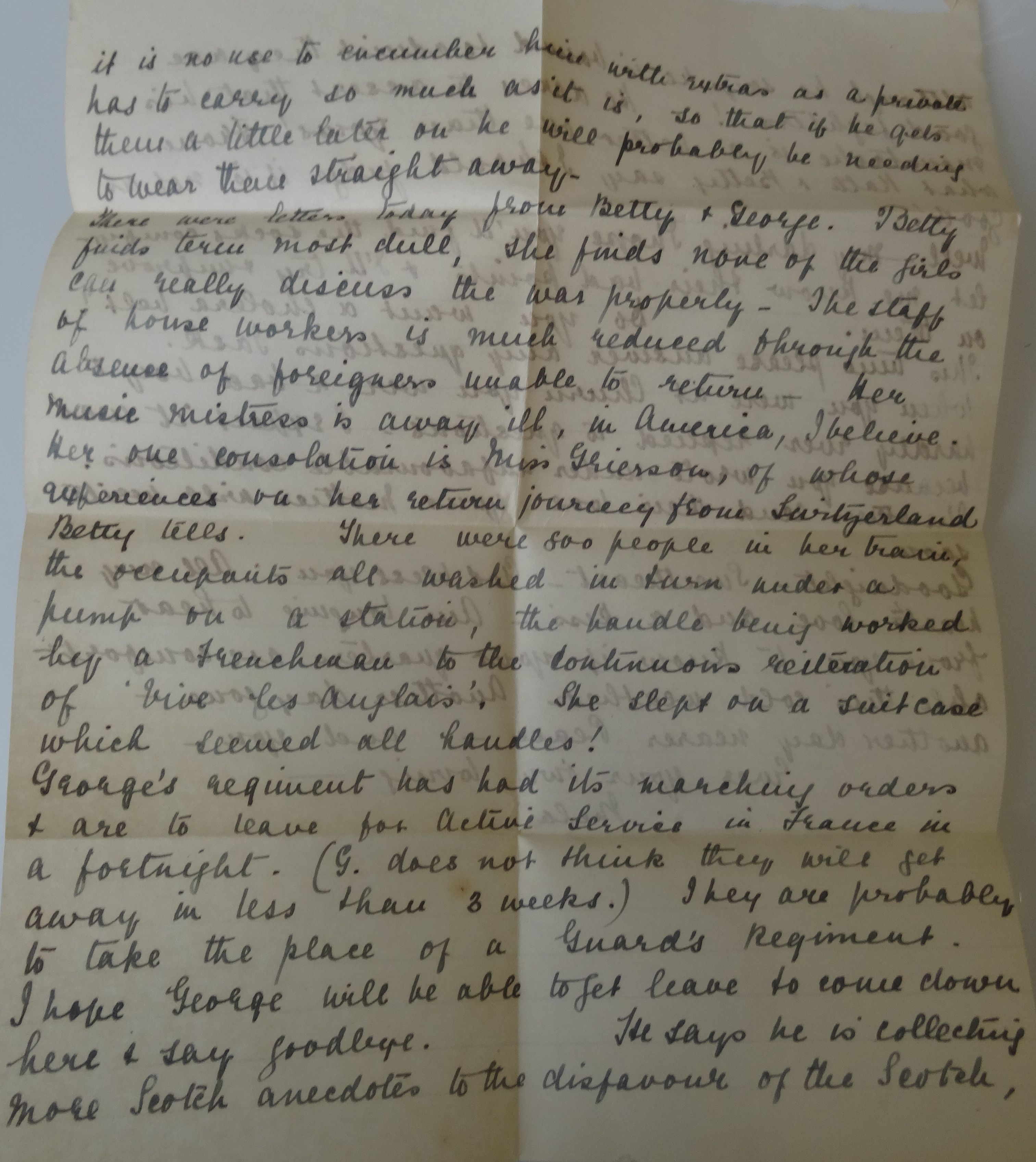 There were letters today from Betty and George. Betty finds term most dull, she finds none of the girls can really discuss the war properly. The staff of house workers is much reduced through the absence of foreigners unable to return. Her Music Mistress is away ill, in America, I believe. Her one consolation is Miss Grierson, of whose experiences on her return journey from Switzerland Betty tells. There were 800 people in her train, the occupants all washed in turn under a pump on a station, the handle being worked by a Frenchman to the continuous reiteration of ‘Vive les Anglais’. She slept on a suitcase which seemed all handles!
