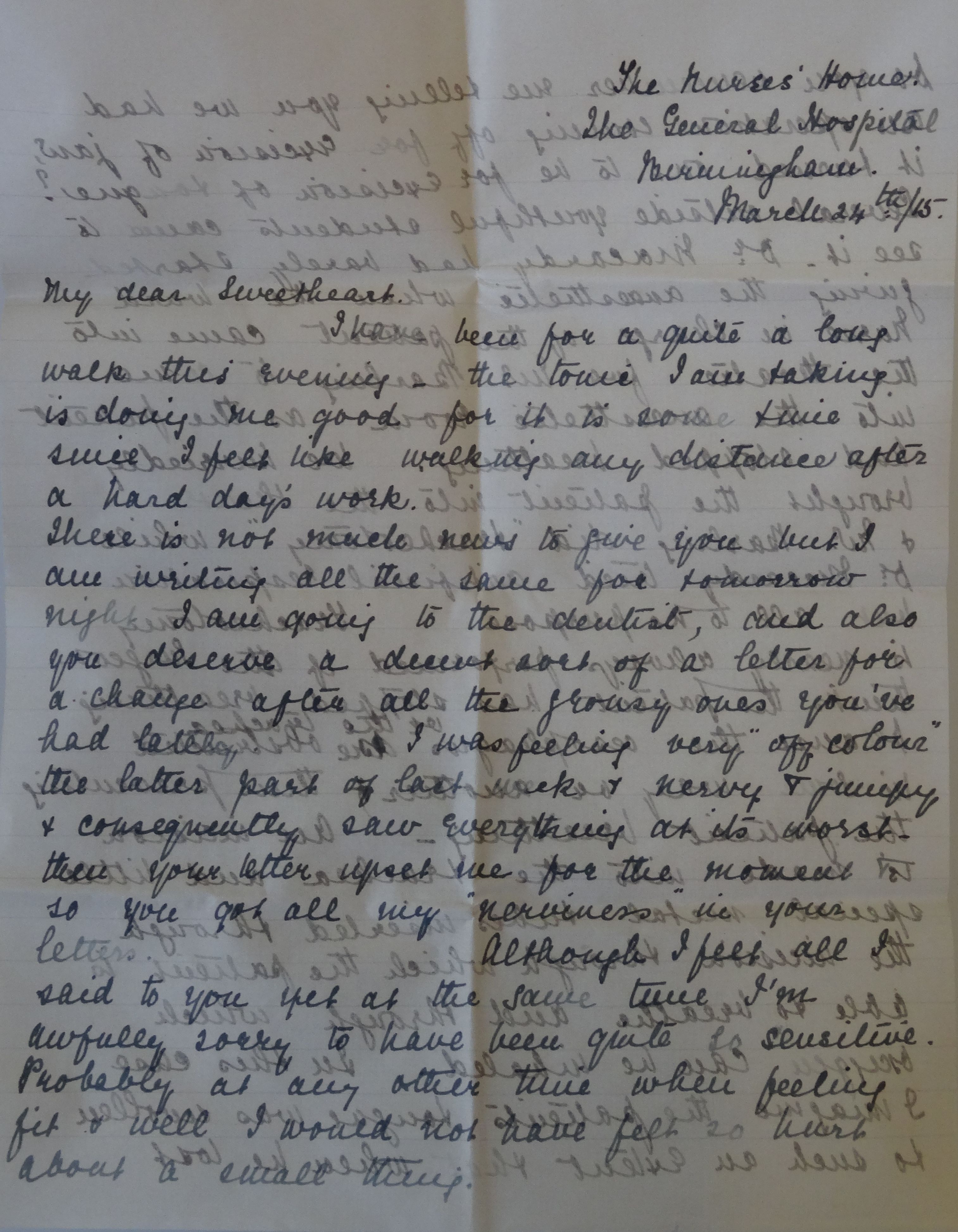 The 2nd year exam: came off on Friday and the “viva” yesterday. So you see we are in the throes of work just at present. I was on until 9. last night because the junior theatre night nurse had to attend her “viva” – the poor thing had awful questions. The “change” will not be before the 2nd or 3rd of April. We are all on tenterhooks wondering where we are going! There are a number of nurses on the sick list just at present so am wondering if I shall be put on night duty after all.