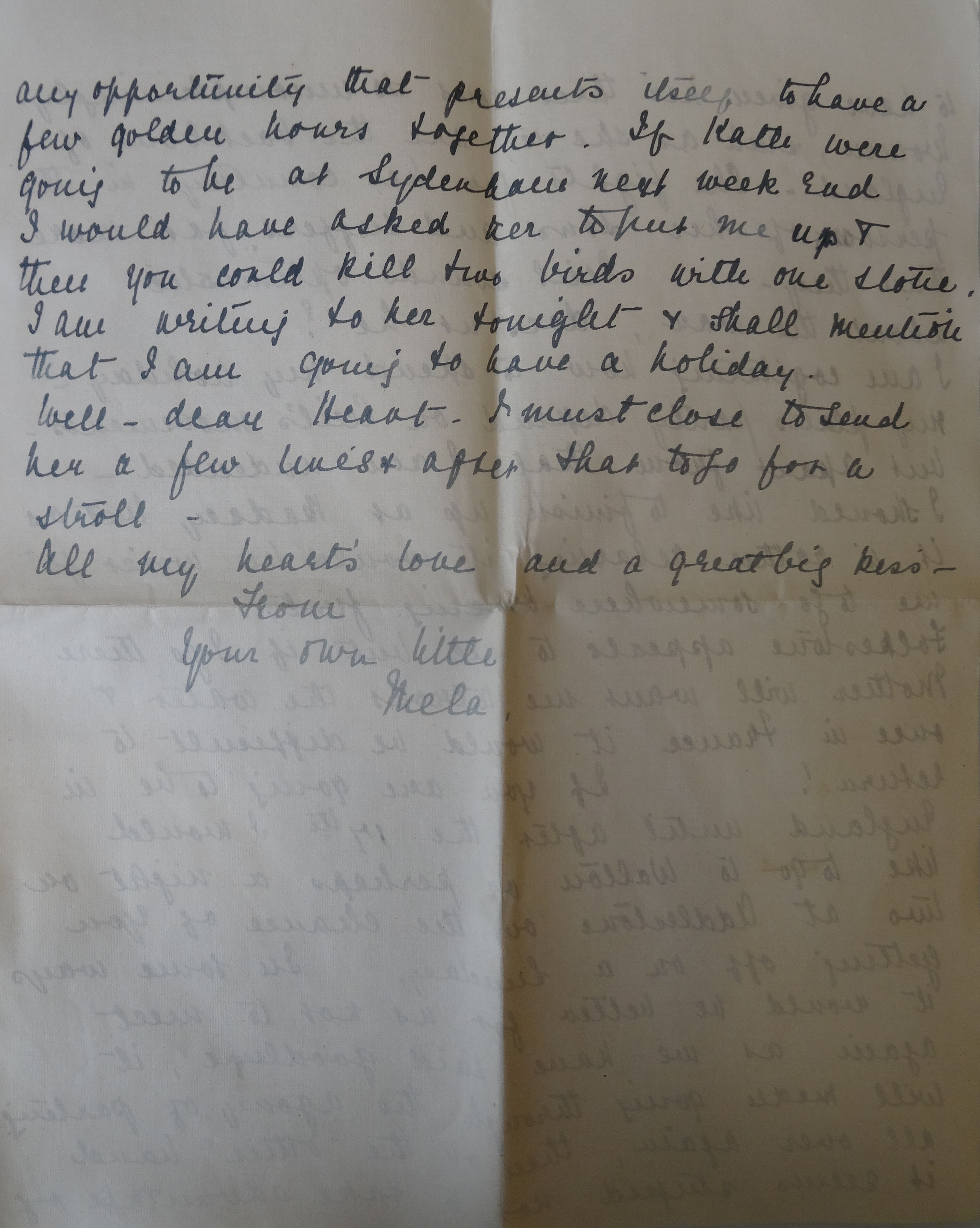 If you are going to be in England until after the 17th, I would like to go to Walton or perhaps a night or two at Addlestone on the chance of you getting off on a Sunday. In some ways it would be better for us not to meet again as we have said goodbye, it will mean going through the agony of parting all over again, then on the other hand it seems stupid not to take advantage of any opportunity that presents itself to have a few golden hours together. If Kath were going to be at Sydenham next weekend I would have asked her to put me up and then you could kill two birds with one stone. I am writing to her tonight and shall mention that I am going to have a holiday.