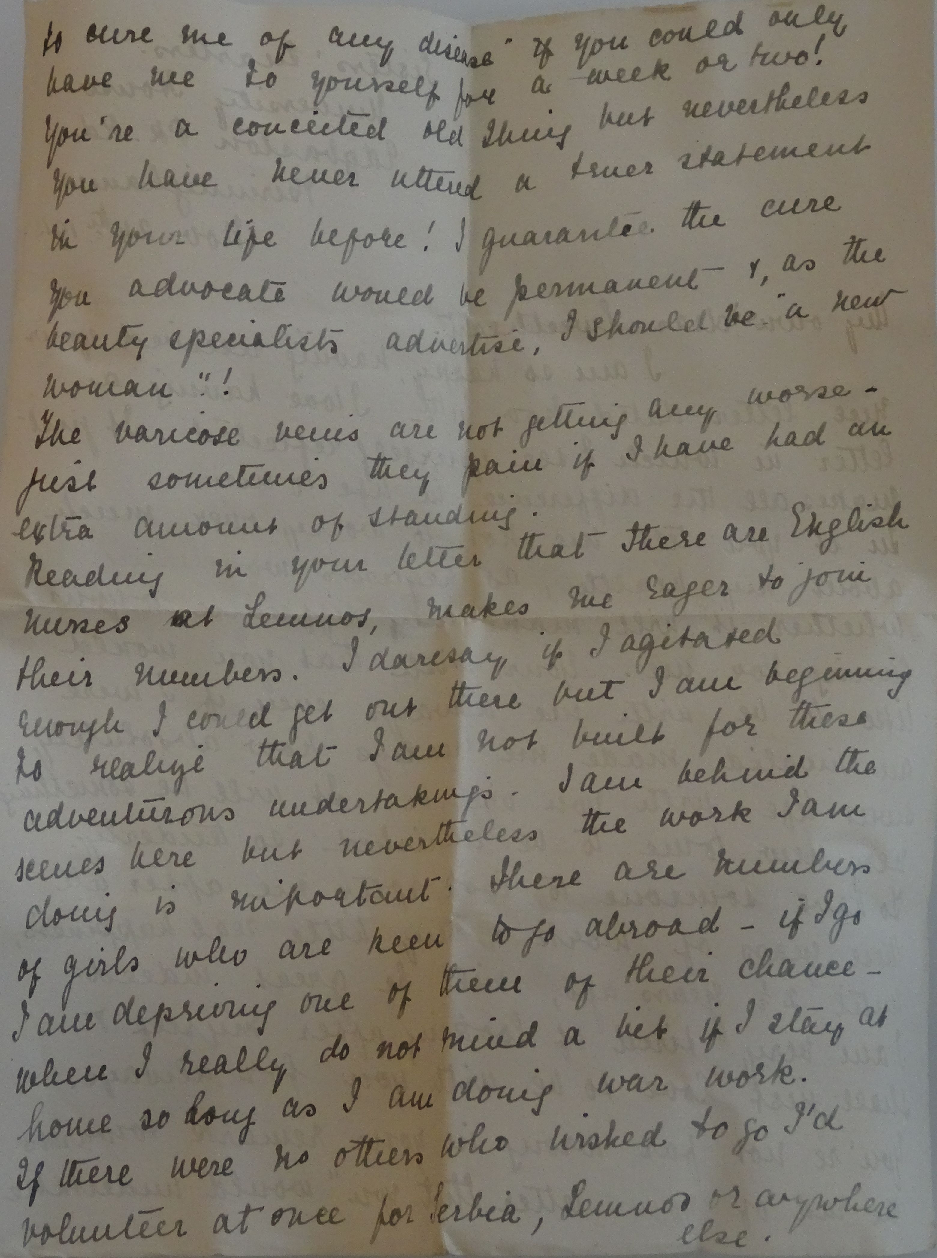 Reading in your letter that there are English nurses at Lemnos, makes me eager to join their numbers. I daresay if I agitated enough I could get out there but I am beginning to realize that I am not built for these adventurous undertakings. I am behind the scenes here but nevertheless the work I am doing is important. There are numbers of girls who are keen to go abroad – if I go I am depriving one of them of their chance – when I really do not mind a bit if I stay at home so long as I am doing war work. If there were no others who wished to go I’d volunteer at once for Serbia, Lemnos or anywhere else.