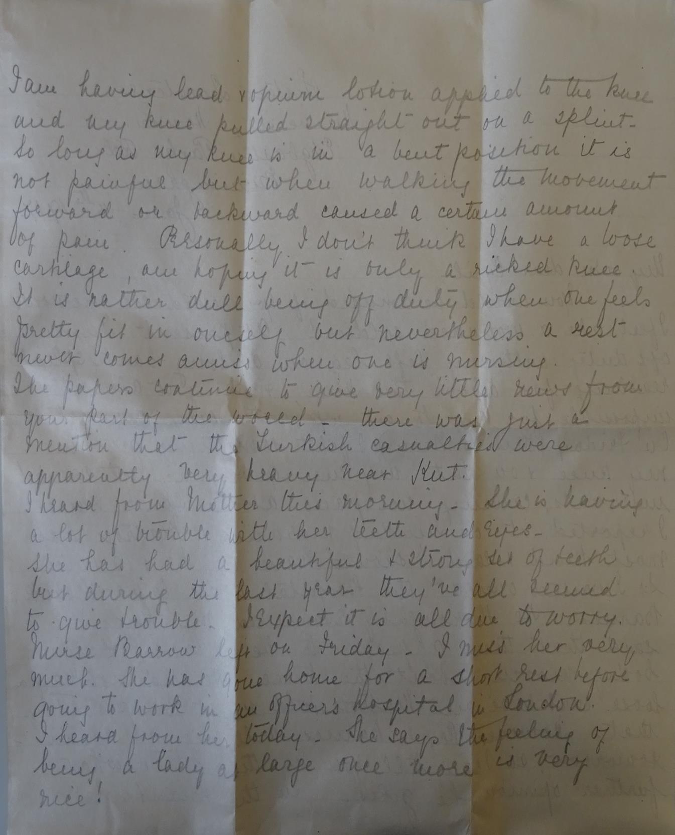 On Friday (this is Monday) I felt something give in my knee and on Saturday my knee gave way at varied intervals, causing me pain at the same time. I reported it on Sunday morning and Matron was most kind and said I should have the best advice. So I waited over at the hospital to see Captain Frank Barnes. He thoroughly examined my knee and said that there appears to be a loose foreign body moving about the knee. He did not say a loose cartilage but Matron told me it was probably that. However Captain Barnes will see me again tomorrow, so I can tell you in this letter what further opinion he gives. In the meantime I am having lead and opium lotion applied to the knee and my knee pulled straight out on a splint. So long as my knee is in a bent position it is not painful but when walking the movement forward or backward caused a certain amount of pain. Personally I don’t think I have a loose cartilage, am hoping it is only a ricked knee. It is rather dull being off duty when one feels pretty fit in oneself but nevertheless a rest never comes amiss when one is nursing.