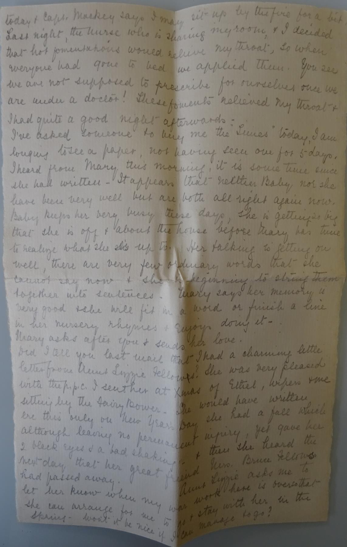 Arthur is back in Rouen feeling “flat” after his stay at Mentone. I write to him occasionally to give him news of you. I thought of sending the letter on to you but on reading it through I see there is a remark which might make you vain and which he did not think you’d see, so I’ll not send it after all! He says he sometimes feels as though he had gone out to the war and missed it! He told me once before that if it had not been for Mary and Baby he would agitate to be sent on the field.