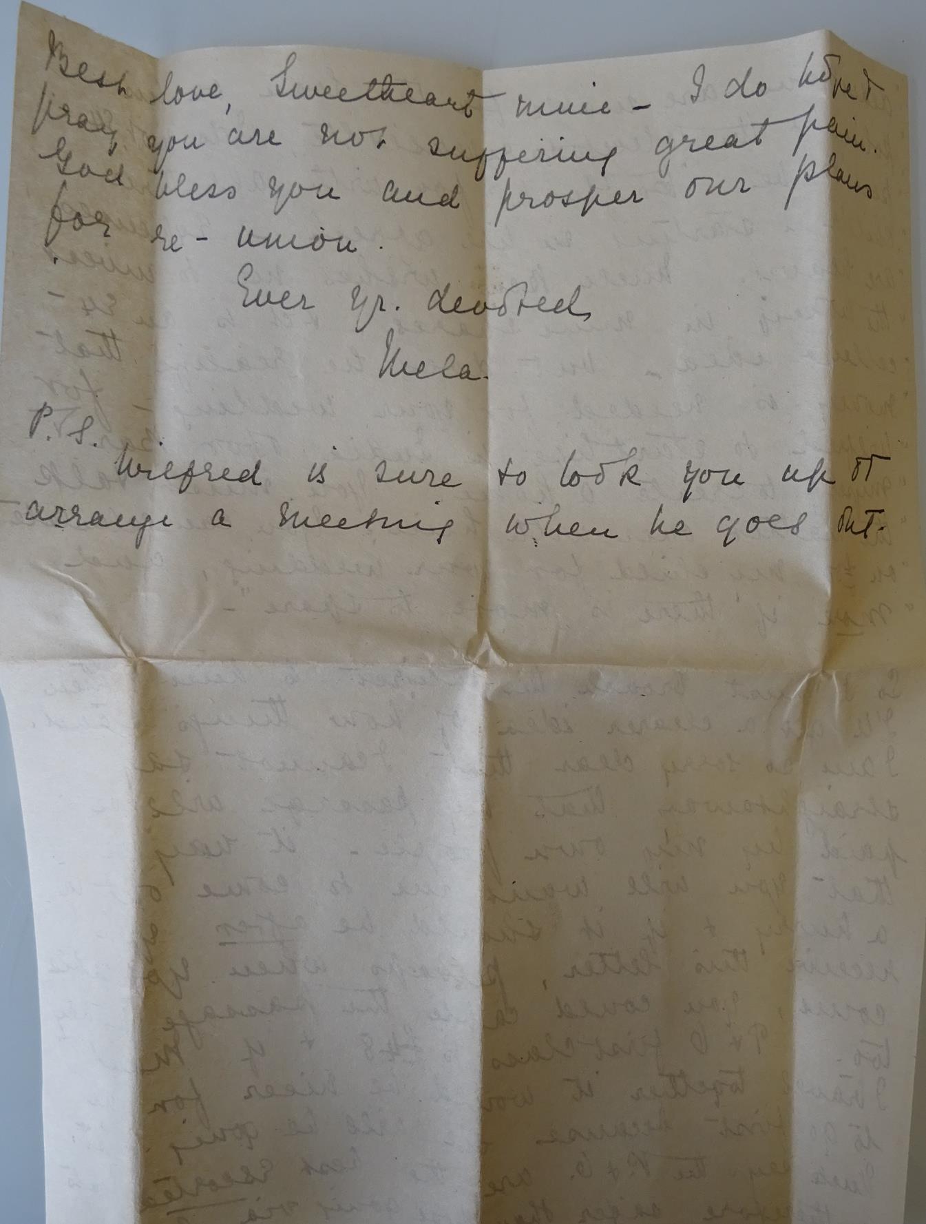I am hoping you will get sent home to England this time to convalesce. All at Badsey are wanting to see you again and I am sure you are longing to see them again too. I shall have to try and spare you to them as much as I can, but I’m afraid I shall be very greedy after not seeing you for 2 years. I can hardly realize what our meeting will be like. I mean when we meet alone for the first time. I am very anxious for further news as to the nature of your wound. I do hope it is not a very painful one.