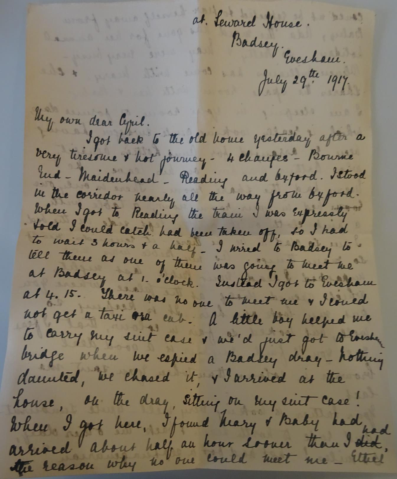 When I got to Reading the train I was expressly told I could catch had been taken off, so I had to wait 3½ hours. I wired to Badsey to tell them as one of them was going to meet me at Badsey at 1 o’clock. Instead I got to Evesham at 4.15. There was no one to meet me and I could not get a taxi or cab. A little boy helped me to carry my suitcase and we’d just got to Evesham bridge when we espied a Badsey dray – nothing daunted, we chased it, and I arrived at the house, on the dray, sitting on my suit case!