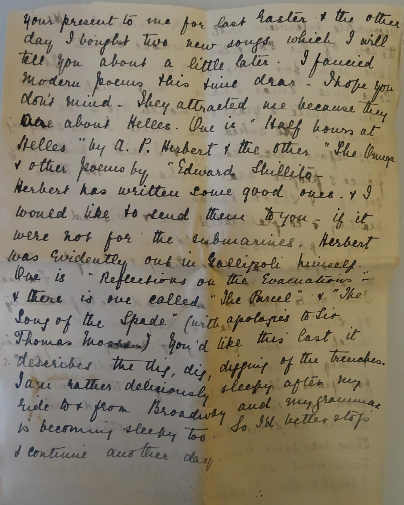 There was some time to spare before our train went so we did a little shopping. I bought two books of modern poetry, as your present to me for last Easter and the other day I bought two new songs which I will tell you about a little later. I fancied modern poems this time dear. I hope you don’t mind. They attracted me because they are about Helles. One is “Half hours at Helles” by A P Herbert and the other “The Orange and other poems” by Edward Shillito.