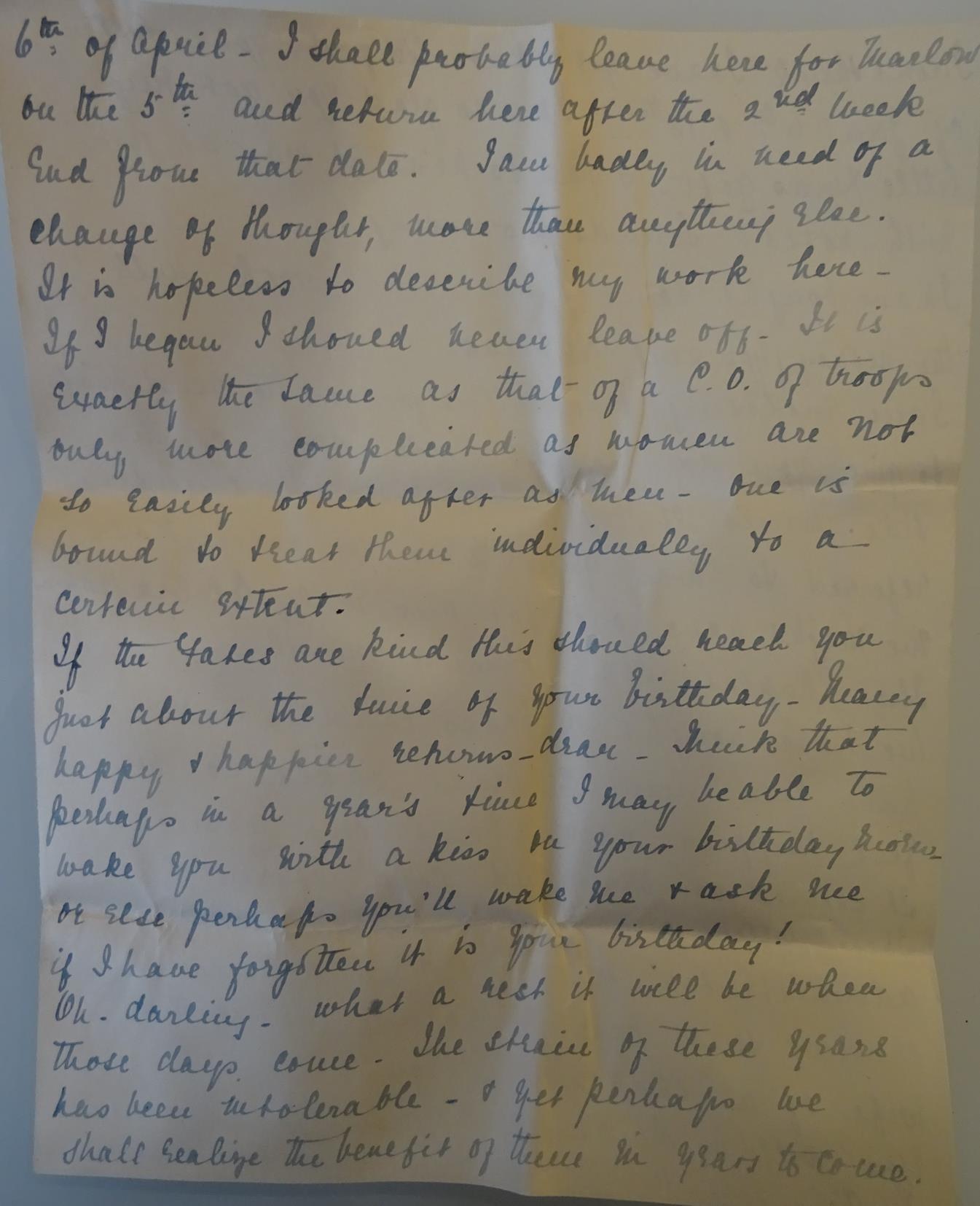 I am going on a week’s official leave from the 6th of April. I shall probably leave here for Marlow on the 5th and return here after the 2nd weekend from that date. I am badly in need of a change of thought, more than anything else.