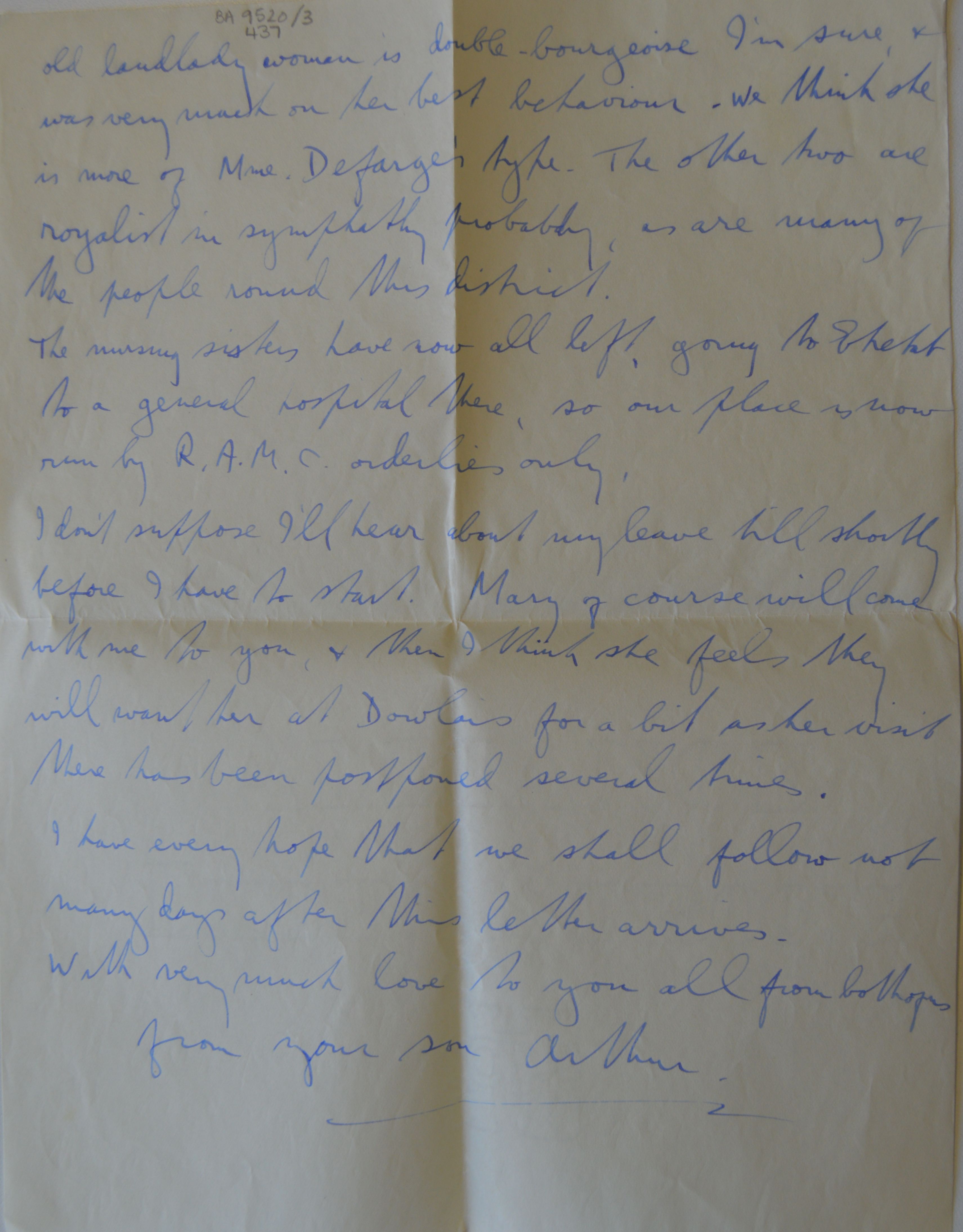 I don’t suppose I’ll hear about my leave till shortly before I have to start. Mary of course will come with me to you, and then I think she feels they will want her at Dowlais for a bit as her visit there has been postponed several times. I have every hope that we shall follow not many days after this letter arrives.
