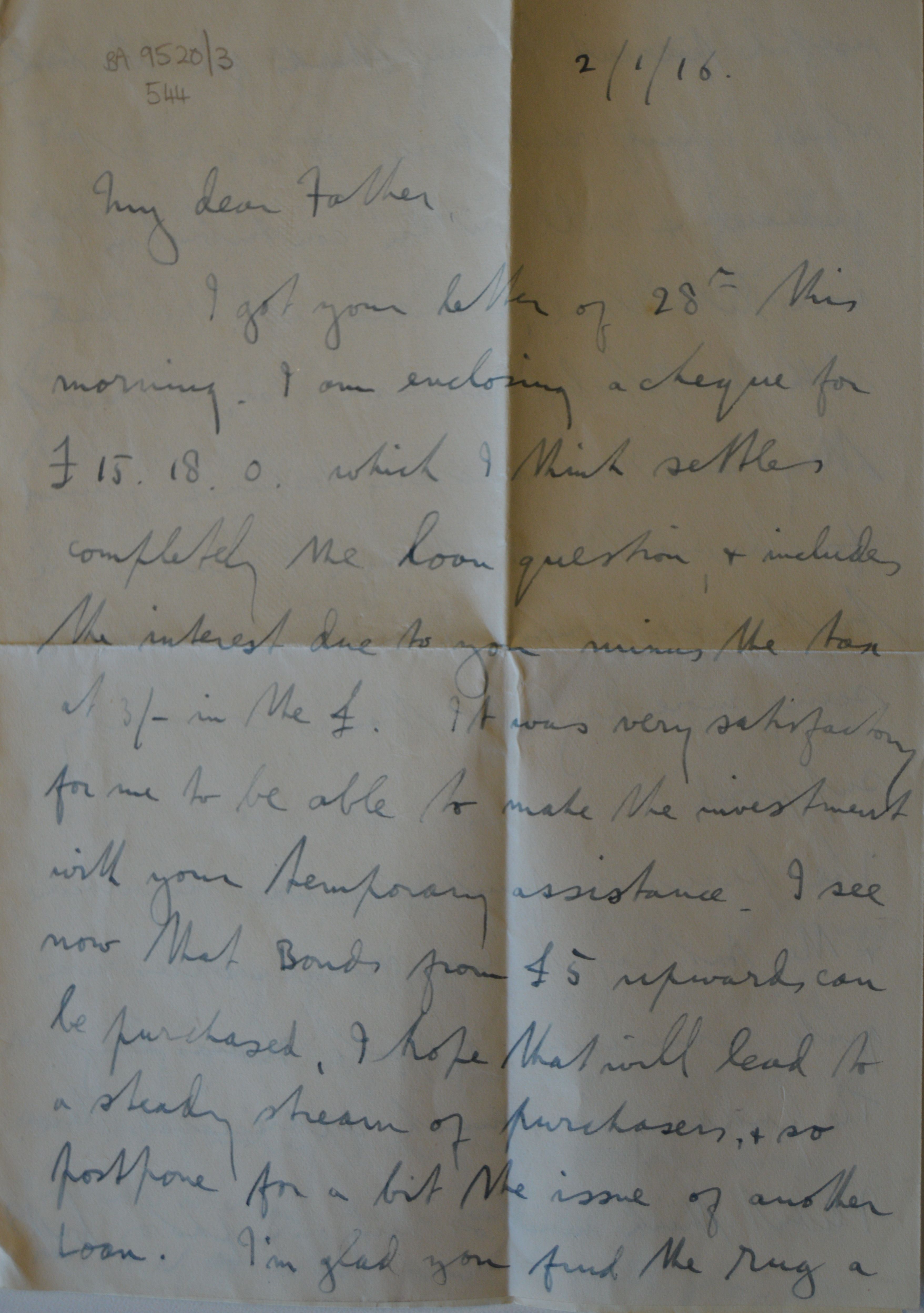 I got your letter of 28th this morning. I am enclosing a cheque for £15.18.0 which I think settles completely the loan question, and includes the interest due to you minus the tax of 3/- in the £. It was very satisfactory for me to be able to make the investment with your temporary assistance. I see now that Bonds from £5 upwards can be purchased, I hope that will lead to a steady stream of purchases, and so postpone for a bit the issue of another loan. I’m glad you find the rug a useful present. Many thanks for the book which I have read twice, it is a most judicial and well-written contribution to war lifetime, and someday will be read with profit by Germans for, at present, they lack the necessary presence of mind for the most part, though I think if the truth were known a certain number are seeing more daylight than is commonly supposed.