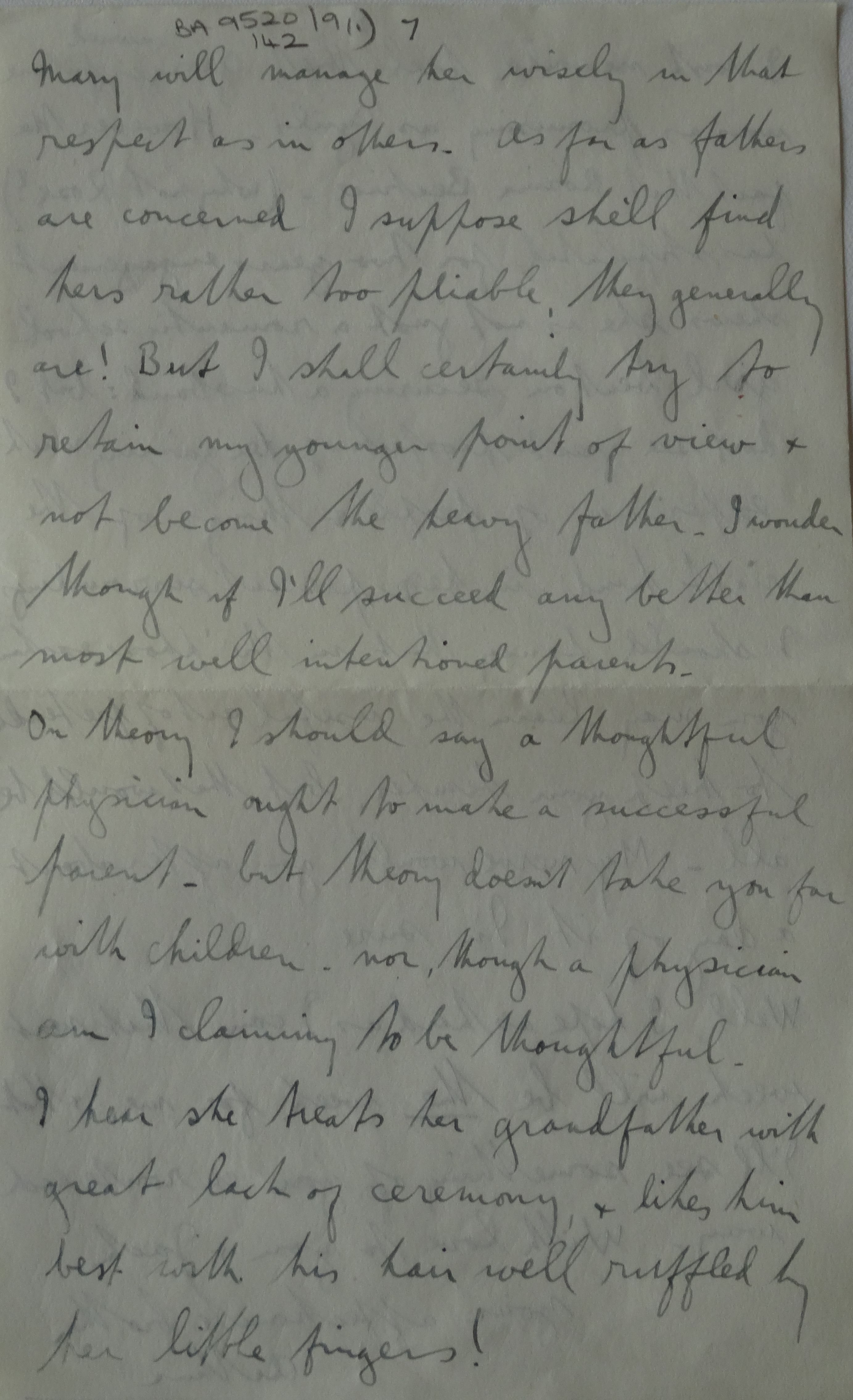 From all I hear about little Babs she is making good headway, not getting very heavy or podgy, and evidently using and developing her senses. Mary considers she has a very decided will of her own, but I feel sure that with proper handling that is a matter for congratulation, and I'm equally sure that Mary will manage her wisely in that respect as in others. As far as fathers are concerned, I suppose she'll find hers rather too pliable, they generally are! But I shall certainly try to retain my younger point of view and not become the heavy father. I wonder though if I'll succeed any better than most well-intentioned parents. On theory I should say a thoughtful physician ought to make a successful parent, but theory doesn't take you far with children. Nor, though a physician am I claiming to be thoughtful. I hear she treats her grandfather with great lack of ceremony and likes him best with his hair well ruffled by her little fingers!