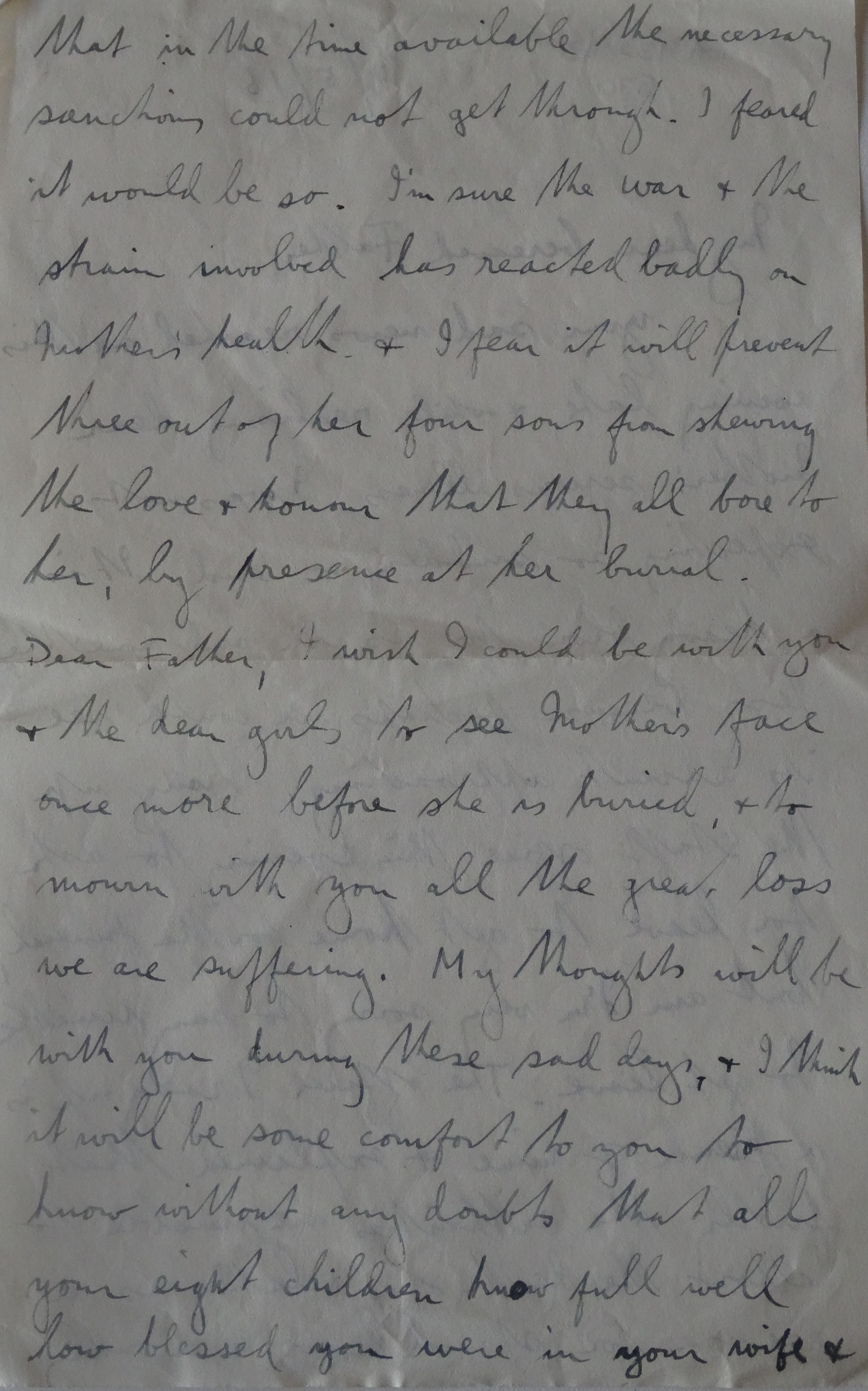 Your sad news reached me this evening late, and while realizing dear Mother’s serious illness, I was not expecting so sudden an end. It is a heavy blow for us all and none the less because we could see its advent approaching. I rang up the staff office this evening to ask for leave to get home for the funeral, but am, I’m very sorry to say, unable to get leave. The officer I rang up is a friend of mine and explained that firstly the authorities are unable to allow the death of a relative as a reason for special leave, and secondly that in the time available the necessary sanctions could not get through. I feared it would be so. I’m sure the war and the strain involved has reacted badly on Mother’s health and I fear it will prevent three out of her four sons from showing the love and honour that they all bore to her, by presence at her burial.
