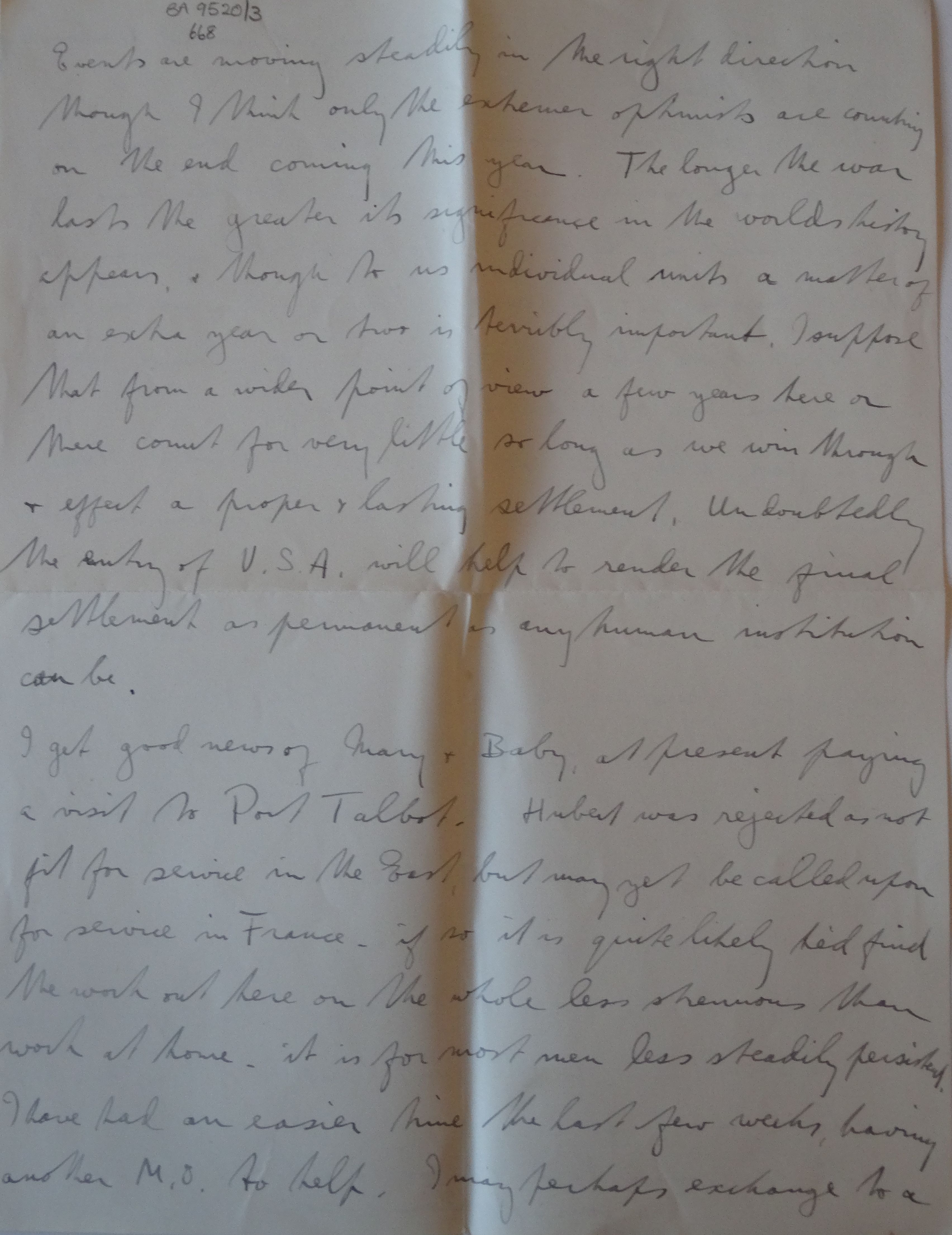 Events are moving steadily in the right direction though I think only the extremer optimists are counting on the end coming this year. The longer the war lasts the greater its significance in the world's history appears, and though to us individual units a matter of an extra year or two is terribly important, I suppose that from a wider point of view a few years here or there count for very little so long as we win through and effect a proper and lasting settlement. Undoubtedly the entry of USA will help to render the final settlement as permanent as any human institution can be.