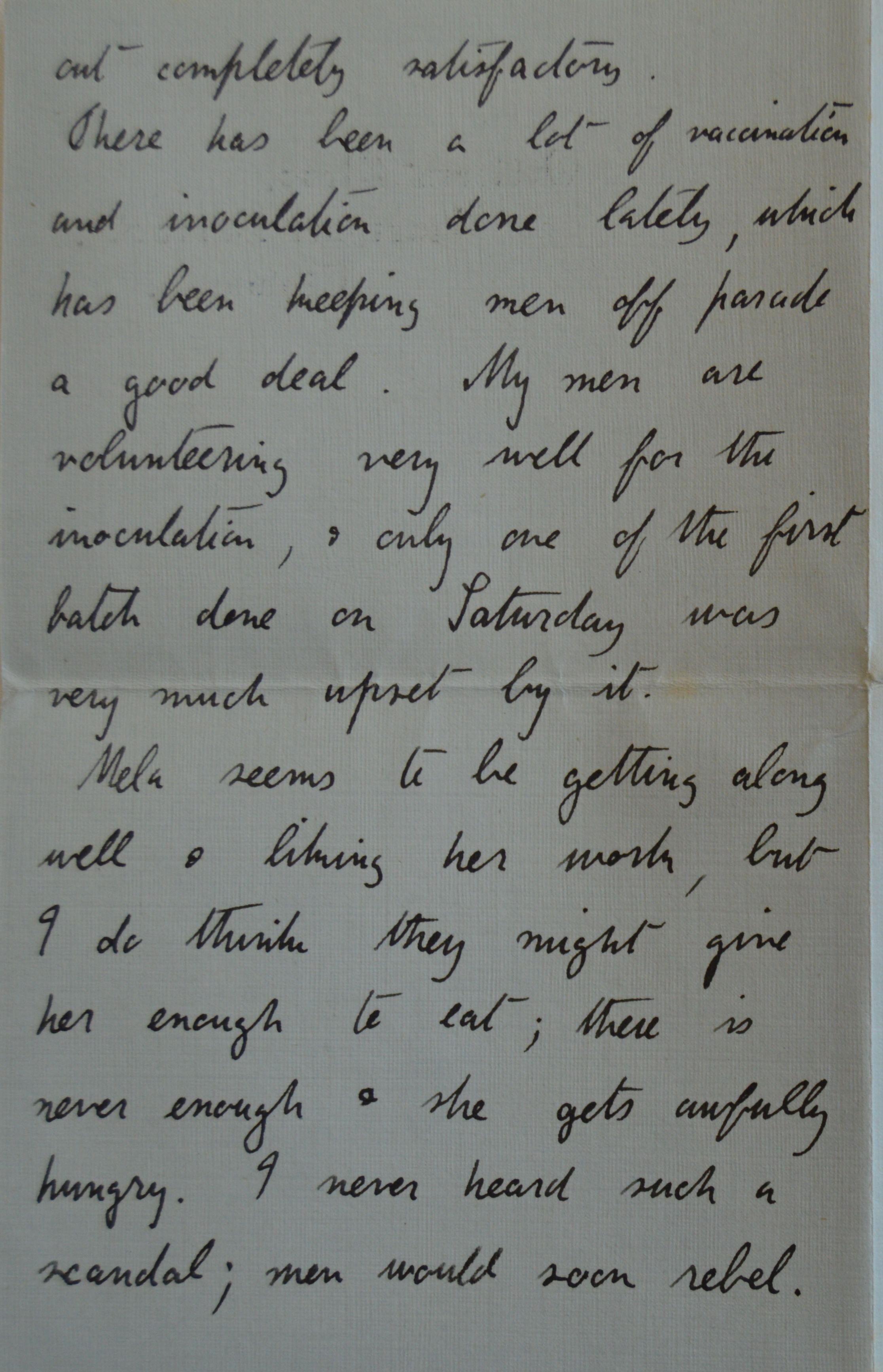There has been a lot of vaccination and inoculation done lately, which has been keeping men off parade a good deal. My men are volunteering very well for the inoculation, and only one of the first batch done on Saturday was very much upset by it.